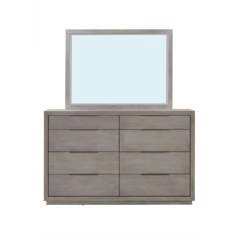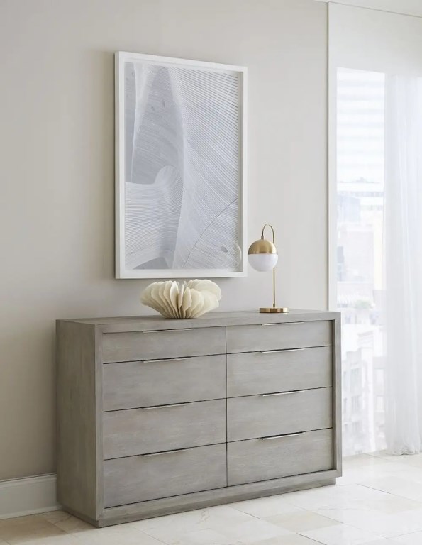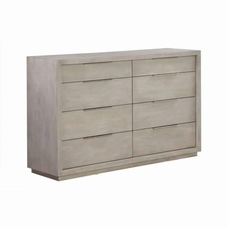 The sleekly tailored Adele bed makes a striking first impression with bold proportions, crisp, modern lines and a weathered finish. Smartly accented with top-mounted nickel plated pulls and a floating plinth base.