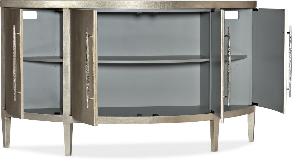 Set a champagne-and-roses mood for everyday spaces with the alluring Amberly Credenza, crafted of Maple Veneers wrapped in linen and covered with silver leaf in a champagne finish. The interior is finished in a tasteful taupe-gray paint, and a textured metal bar pull in a champaign finish adds a final classy touch. Four doors with one adjustable shelf behind the pair of center doors and one adjustable shelf behind each right and left side door.