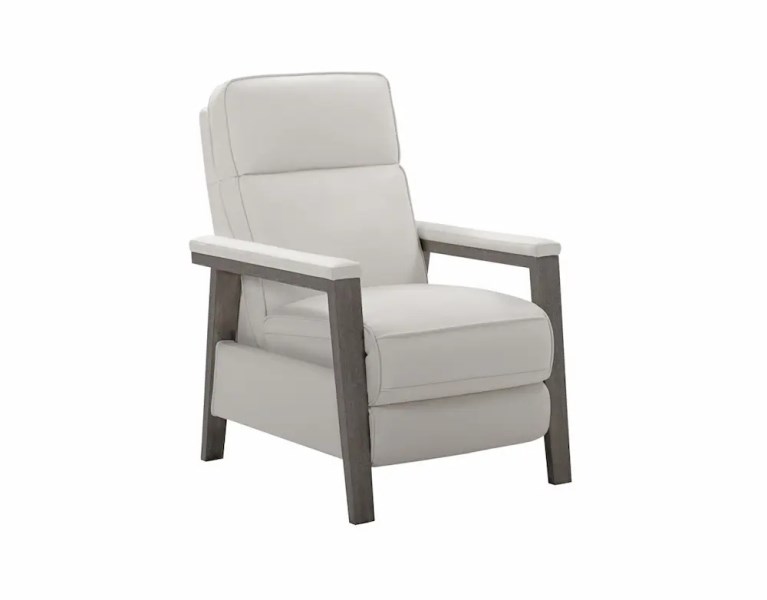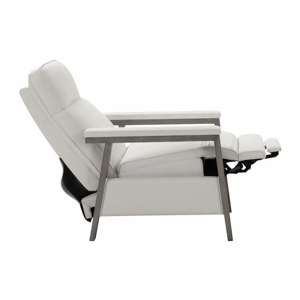 Modern exposed wood frame, push thru the arm 3-way recliner featuring a welted box seat styled pad over chaise with pocketed coil springs, split 43.3?? high pub back, and upholstered cap arms.