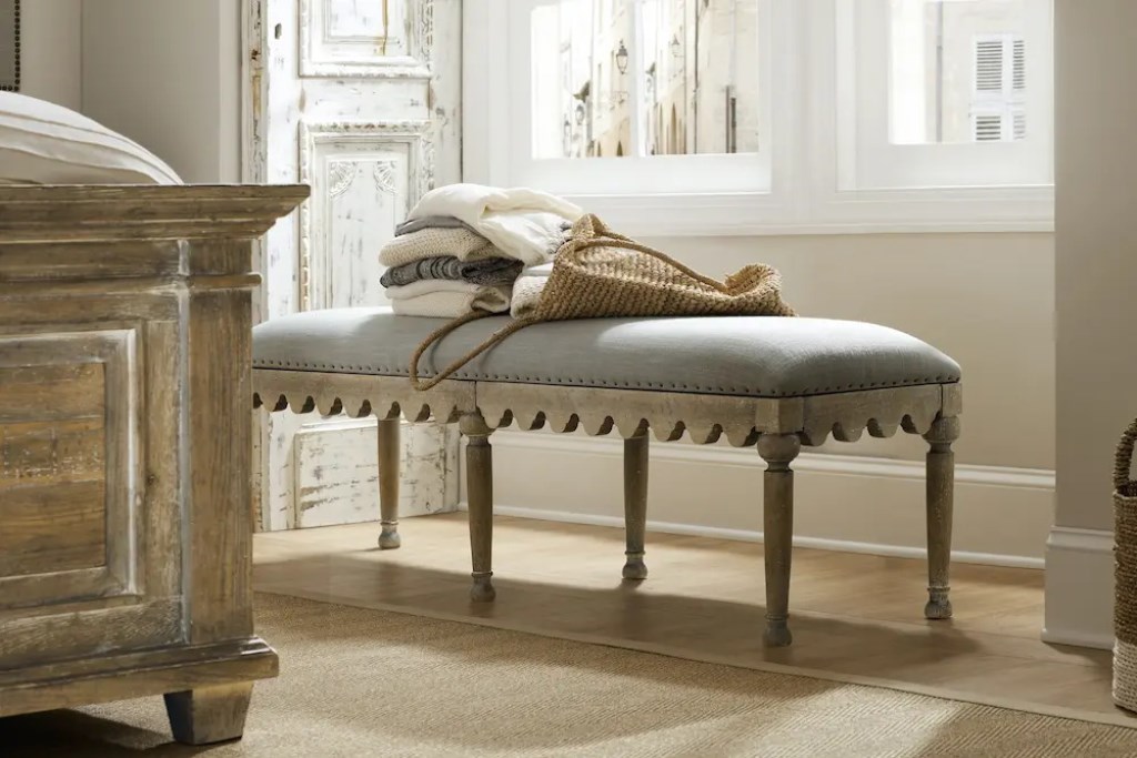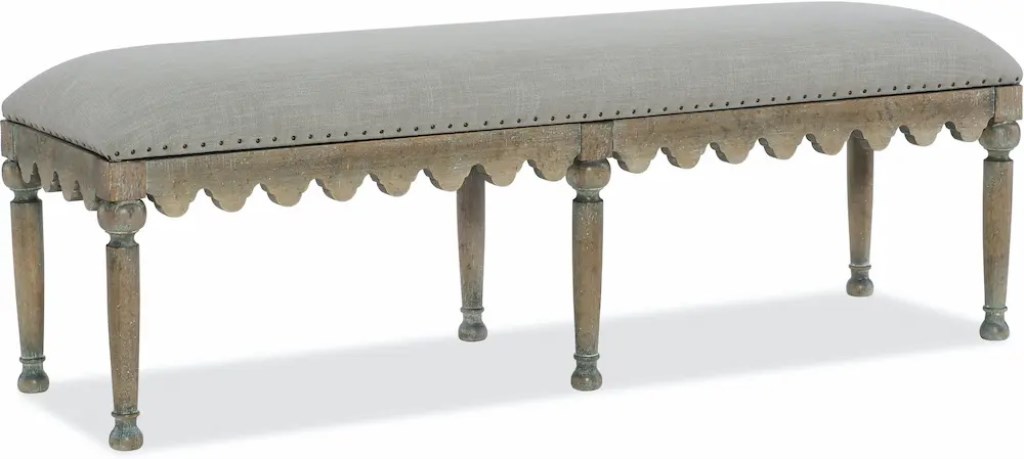 Add a dash of charm and comfort to your room with this multi-purpose Madera Bed Bench featuring a stylish scalloped apron and seat upholstered in the soft gray Antwerp Linen and accented by decorative bronze nailhead trim.