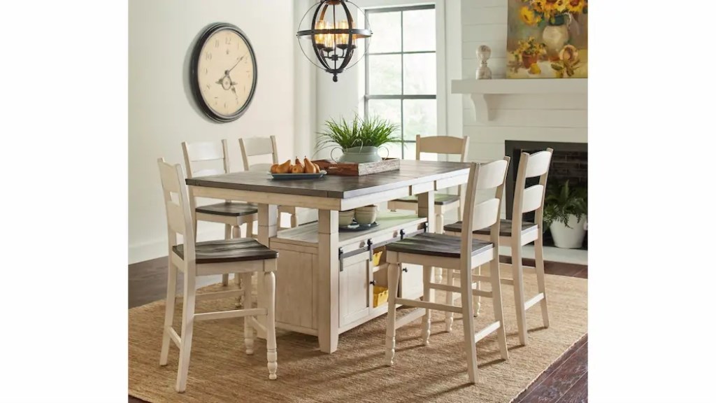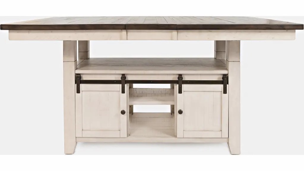 Expertly crafted using solid reclaimed pine, this dining collection provides relaxed sophistication for creative and comfortable entertaining. With options for any size dining space and the choice of three different finishes ?C Barnwood, Vintage Black, and Vintage White ?C this group blends rustic and natural style to bring a unique and exceptional feel to your home. Can be used as a standard or counter height dining table with the use of included risersStorage base has six shelves behind sliding barn doors. They are 12.5″W x 14″D. Shelf on top of storage base: 42″W x 19″DTable Dimensions:Width (side to side): 42″ WDepth (front to back): 60″ DHeight (bottom to top): 30″ HMax Depth (front to back): 72″ D