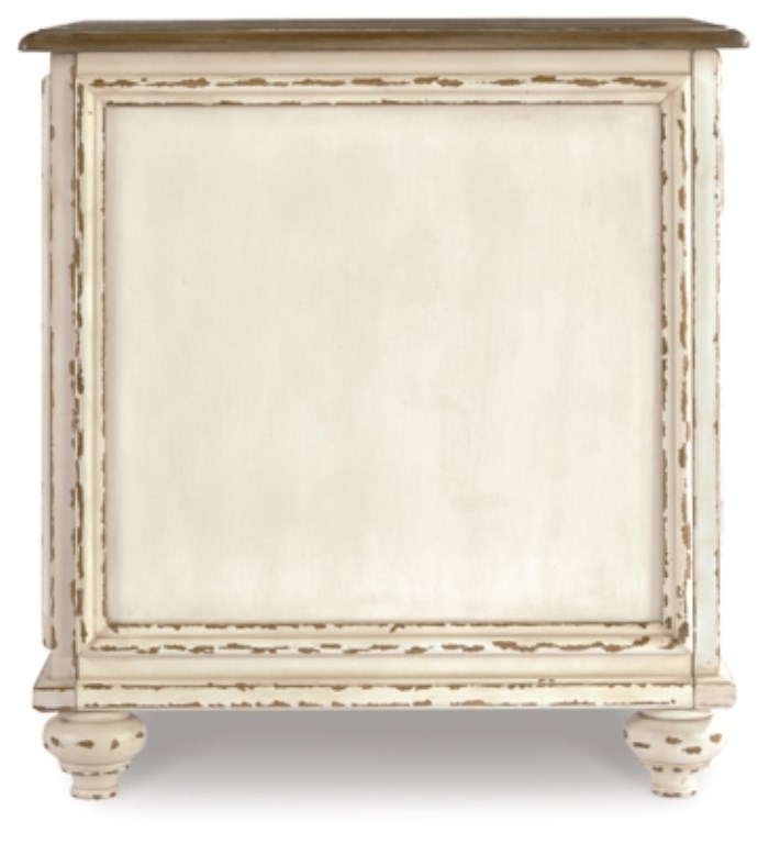 Elevating the art of traditional cottage styling, this chairside end table is sure to serve you beautifully for years to come. Antiqued two-tone aesthetic blends a chipped white with a distressed wood finished top for added charm. Cabinet door features inset mirror with filigree moulding for a fanciful twist. Made of veneers, wood and engineered wood Antiqued two-tone finish Cabinet door with inset mirror Single shelf storage Rubbed dark gray hardware