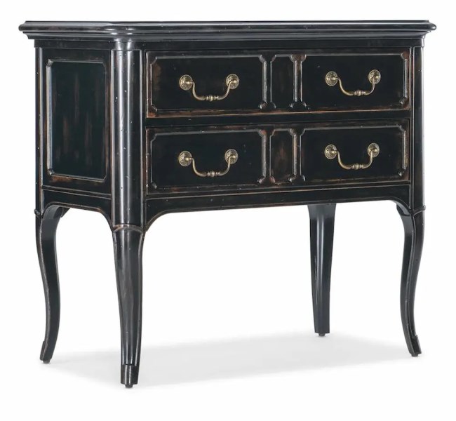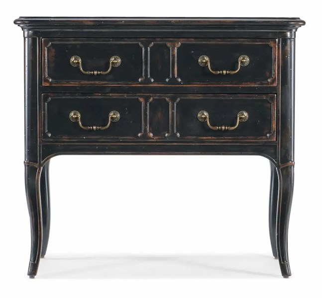 The Two-Drawer Nightstand features self-closing drawers, two port USB charger on the back with cord clips. The Black Cherry finish emulates the vibrancy of the warm cherry finish shining from beneath the Black Cherry patina and includes subtle distressing which exemplifies the heirloom nature of the collection. Antique bronze bail pull hardware.