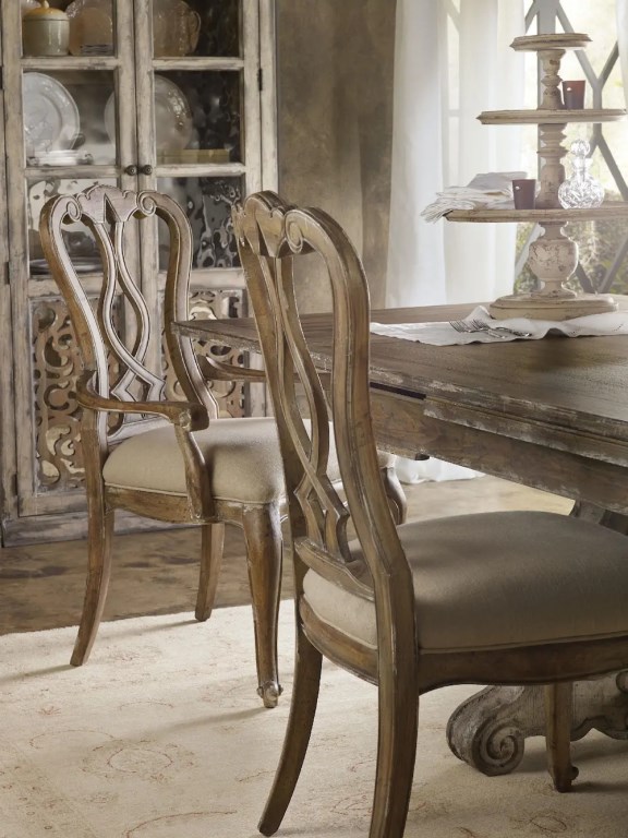 Enjoy a luxurious but casual dining experience with this elegant leg dining table inspired by timeless farm style antiques. Two 18-inch leaves extend the table to 108 inches to seat up to eight guests. Crafted of Poplar and Hardwood Solids with Pecan, Walnut and Maple Veneers with a solid wood edge. Come home to your little castle. Relax in a livable luxury with Chatelet, a whole home collection inspired by timeless farm style antiques found in ”little castles” of Old World Europe.Two 18” leaves extends table to 108”Will seat up to eight guests with leavesChatelet Dining Table Dimensions:Width: 72″ (182.9 cm)Depth: 42″ (106.7 cm)Height: 30″ (76.2 cm)Weight: 206.8 lb (93.1 kg)Splat Back Chair Dimensions:Width: 21 3/4″ (55.2 cm)Depth: 25 1/2″ (64.8 cm)Height: 41 1/2″ (105.4 cm)Weight: 44 lb (19.8 kg)