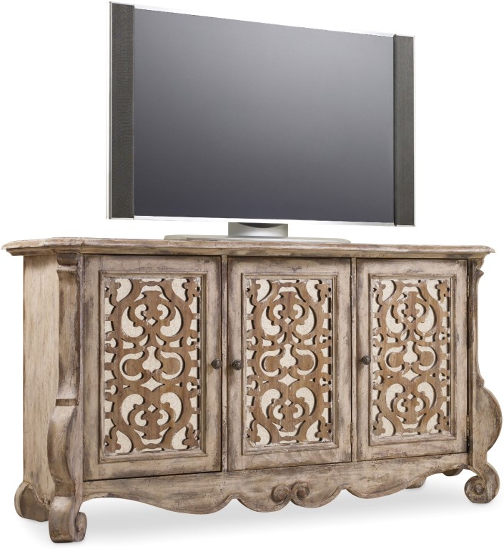 Elevate your entertainment in livable luxury. The timeless Chatelet Entertainment Console features 3 mirrored fretwork doors, a scalloped base and the soft amber Caramel Froth finish. The accent finish is Paris Vintage, a distressed white with fretwork overlay. The antique mirror behind the fretwork is removable. Behind each door are two adjustable shelves. One three-plug outlet. Accommodates up to a 65-inch TV. Come home to your little castle. Relax in a livable luxury with Chatelet, a whole home collection inspired by timeless farm style antiques found in ”little castles” of Old World Europe.