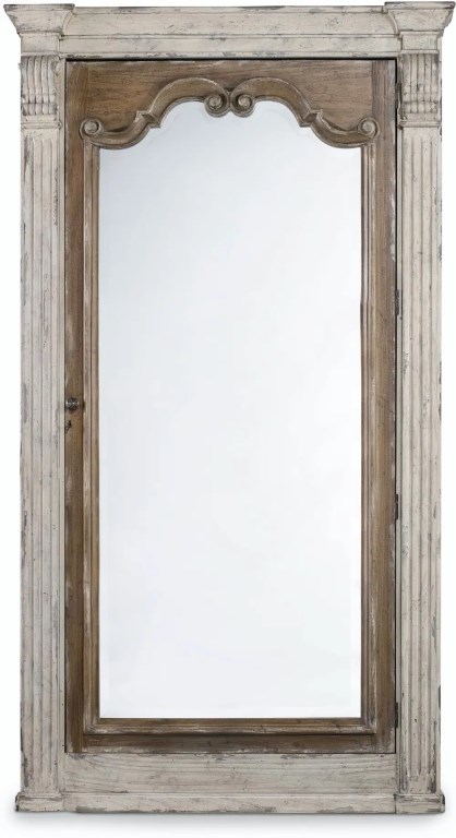 Be enchanted each time you open the timeless Chatelet Floor Mirror with storage space to organize all your necklaces, earrings, bracelets and rings. The mirror combines the soft amber Caramel Froth finish and the antique white Paris vintage finish for a rich neutral blend with warm appeal. Inside the mirror is a felt-lined back panel with jewelry bags, hooks and ring holders and two dividers for necklace storage. Attaches to the wall for security. Come home to your little castle. Relax in a livable luxury with Chatelet, a whole home collection inspired by timeless farm style antiques found in ”little castles” of Old World Europe.