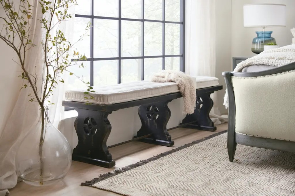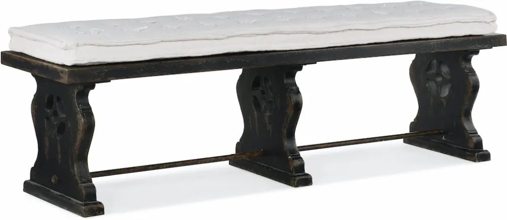 Add vintage elegance and extra seating to your dining table, the foot of your bed, your hallway or family room with this versatile Ciao Bella Bench. The unique harp-shaped legs form a beautiful base, along with a burnished brass stretcher. The exquisite black finish has multi-layered rub-through, giving the appearance it is aged gracefully through the decades. The lay-on cushion in Tuscan White is button tufted on one side with French Primitive tufting on the other side for comfort. Inspired by the small farmhouses that dot the French and Italian countryside and have been in the hands of the same family for generations, Hooker Furniture introduces the rustic Ciao Bella Collection. The whole home collection is an eclectic mix of European farmhouse pieces that have the appearance of furniture that has been refinished multiple times as it has passed through the generations. Ciao Bella includes bedroom, dining room, occasional, home office and accent furniture, and features a finish called Timeworn Gray that accentuates the historical nature of European farmhouses – many of which include a variety of furniture styles that have been added by each generation of owners.