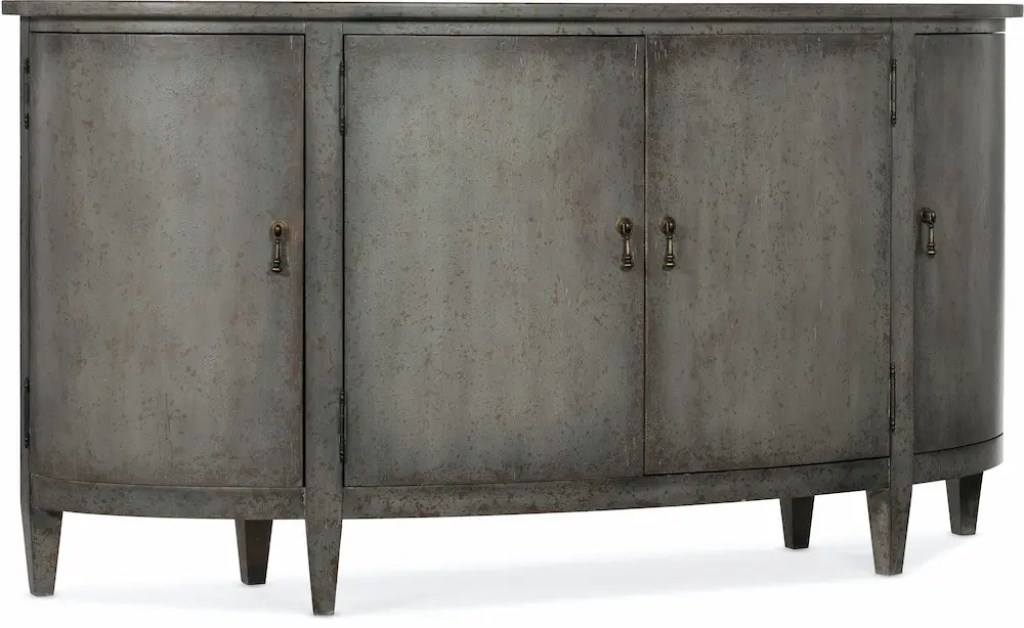 Inspired by European farmhouses, the graceful silhouette of the Ciao Bella Buffet will give a designer flair to any room. As a delightful bonus, this piece is packed with storage, with one adjustable shelf behind each pair of center doors, 2 fixed shelves behind the left and right doors, 2 drawers behind the center doors and drop-in felt liners with silverware storage. Crafted of Poplar and Hardwood Solids with Maple Veneers, the buffet features a character-filled Speckled Gray finish with hand chiseling and multi-layer rub-through. Tear-drop hardware adds a sparkle of style. Inspired by the small farmhouses that dot the French and Italian countryside and have been in the hands of the same family for generations, Hooker Furniture introduces the rustic Ciao Bella Collection. The whole home collection is an eclectic mix of European farmhouse pieces that have the appearance of furniture that has been refinished multiple times as it has passed through the generations. Ciao Bella includes bedroom, dining room, occasional, home office and accent furniture, and features a finish called Timeworn Gray that accentuates the historical nature of European farmhouses – many of which include a variety of furniture styles that have been added by each generation of owners.