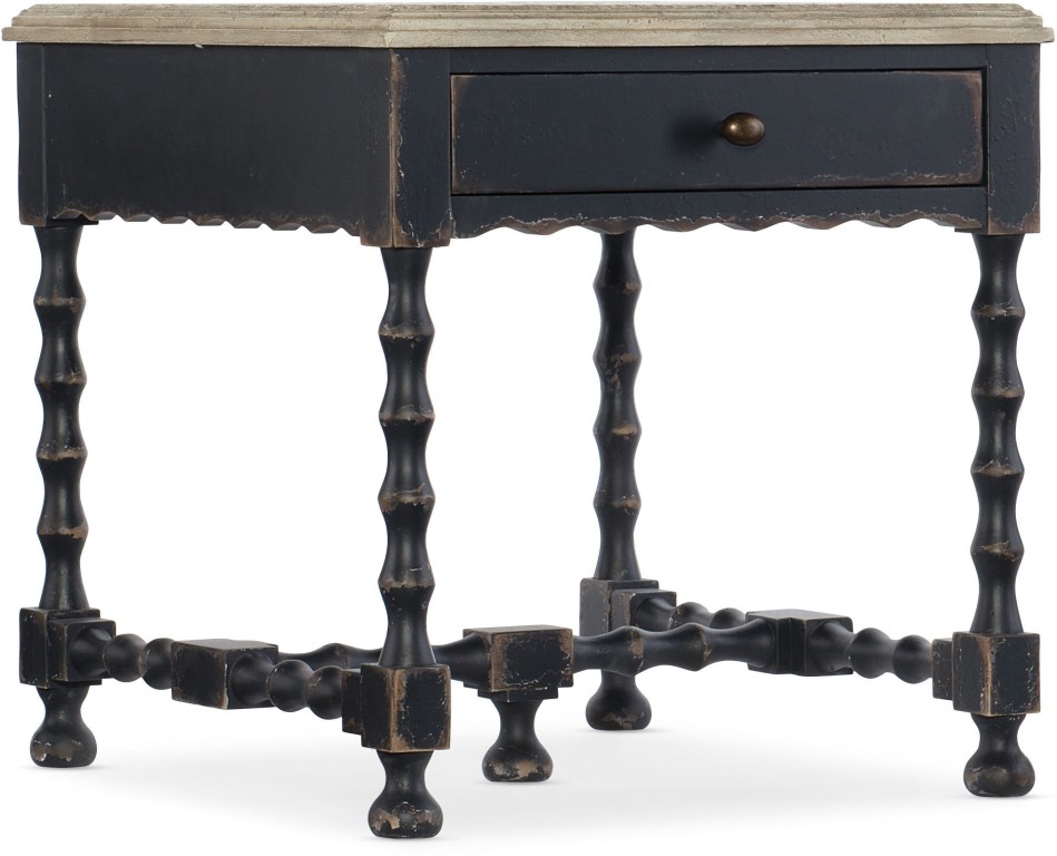 Exuding charm and character, the Ciao Bella Rectangular End Table contrasts a black base with a Flaky White top. Crafted of Poplar and Hardwood Solids and Maple Veneers, the finish is hand chiseled and wire brushed, giving the appearance of aging through the generations. The turned legs and stretchers have a vintage appeal.