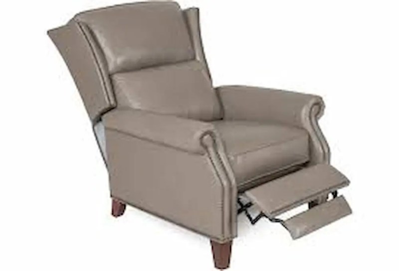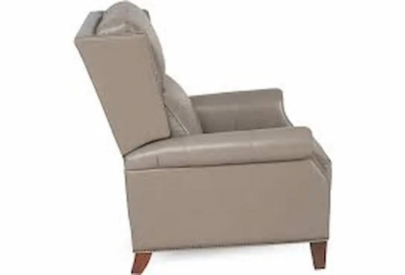 An elegant wing back and nailhead trim give this push thru arm leather recliner a sophisticated look. It is sure to be a comfortable spot to relax and a lovely accent piece for any room in your home. It is available in four colors; Caramel, Chocolate, Dark Grey and Taupe.