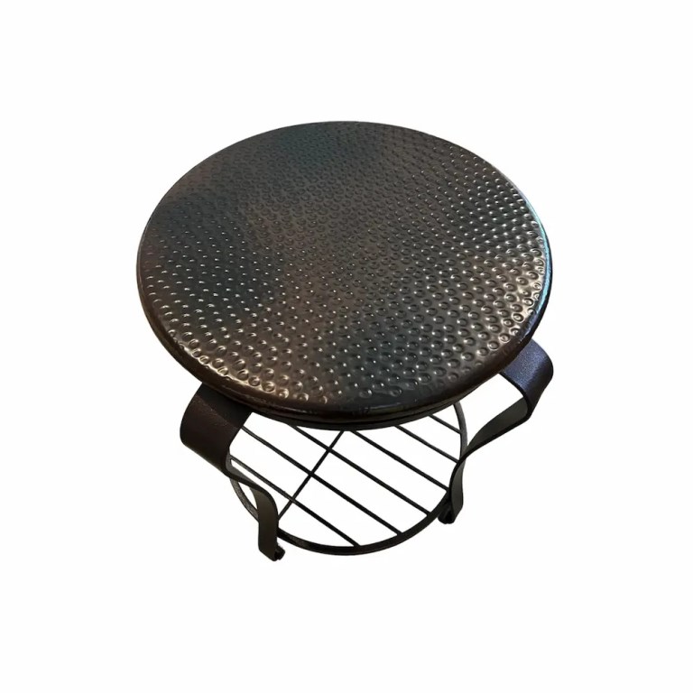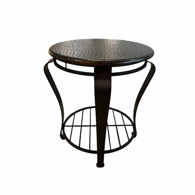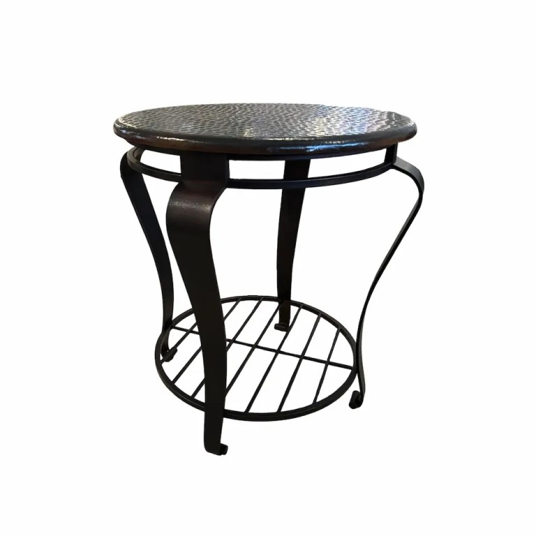 Add a rustic accent to your home with this Round End Table featuring a wrought iron base with curved legs and a metal slat shelf for storage, along with a hammered copper top finished in a dark brown with black undertones.