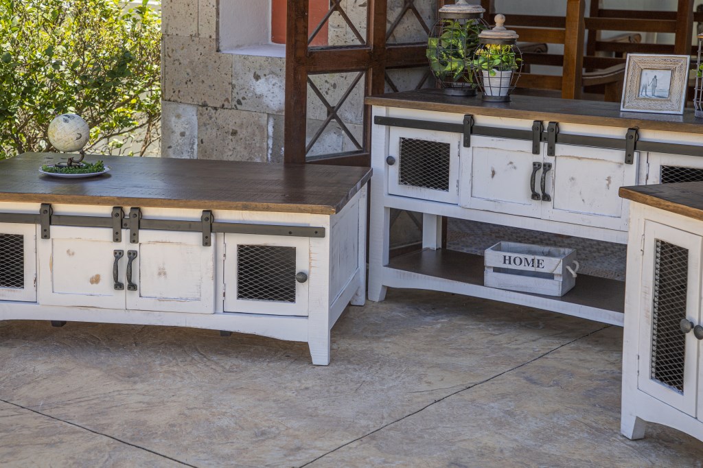 The Costa Sofa Table features 100% solid pine with a multi- step White finish on distressed wood. Tops feature a medium brown stain that provides depth and characted to solid pine. Solid tops are floated to allow for wood’s natural movement. Barn doors with functional rolling mechanism add a unique look. Side doors feature metal mesh on panels add rustic industrial appeal.