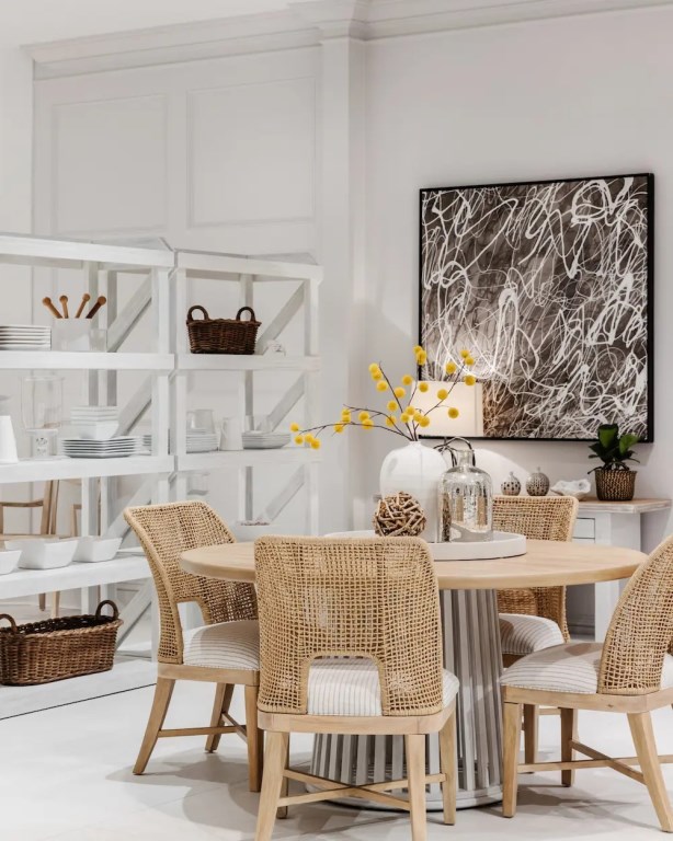 Natural materials meet sleek modern design in this woven sling chair, featuring a comfortably curved back woven in natural cane. A fully upholstered seat in a finely tailored ticking stripe fabric completes the look, making it a striking addition to this eclectic collection.