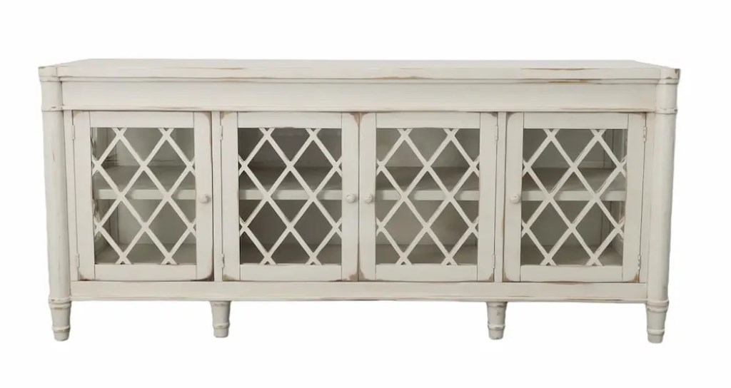 This beautiful glass front solid wood console will be at home in any room of your house. This cabinet has a myriad of uses including entertainment center, dining buffet, bookcase, etc. The soft color and distressed finish works with many different decors, from traditional to rustic.