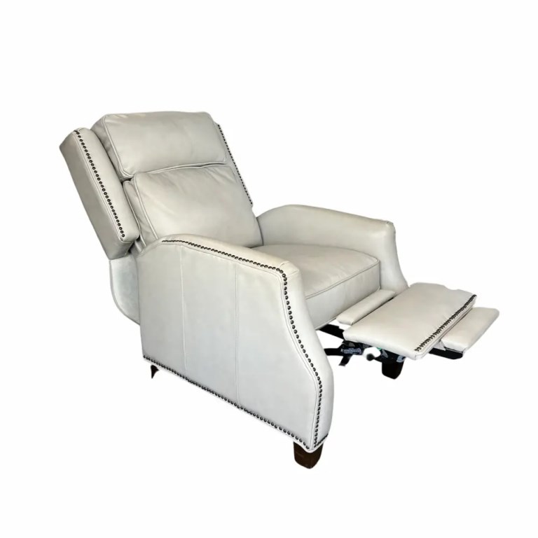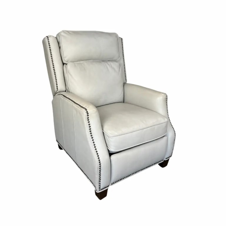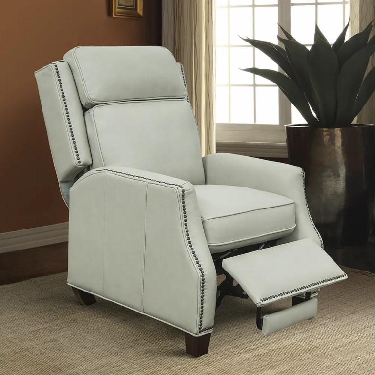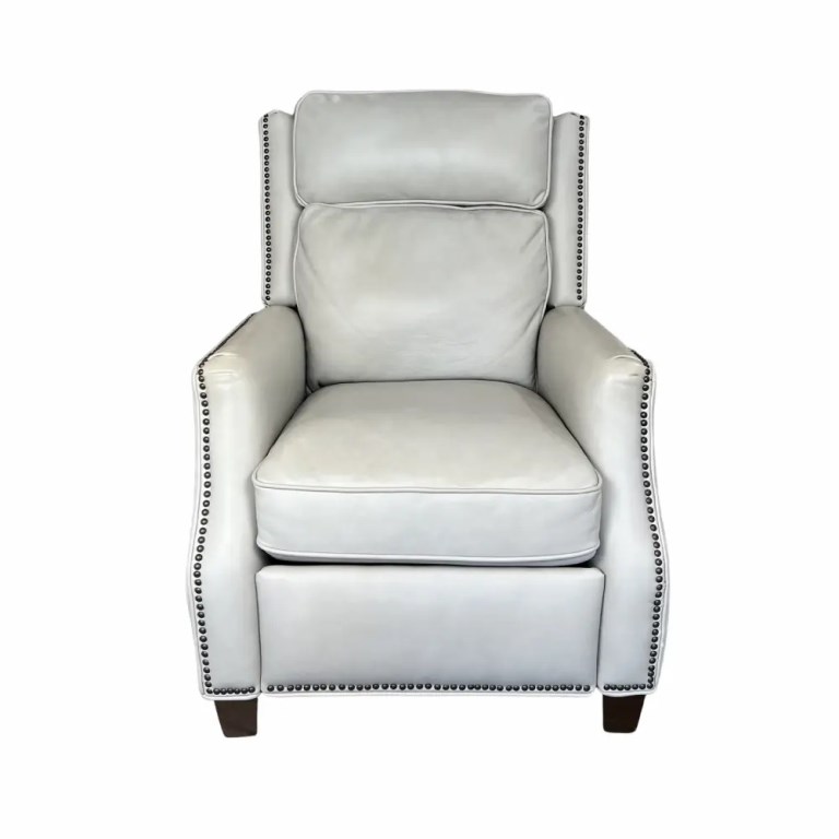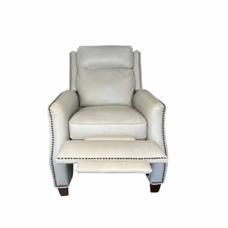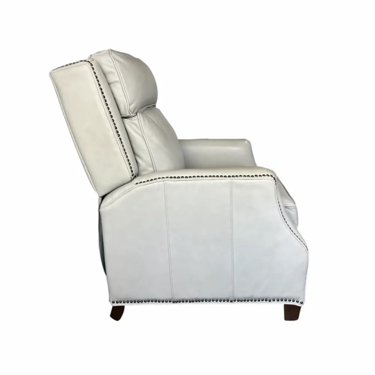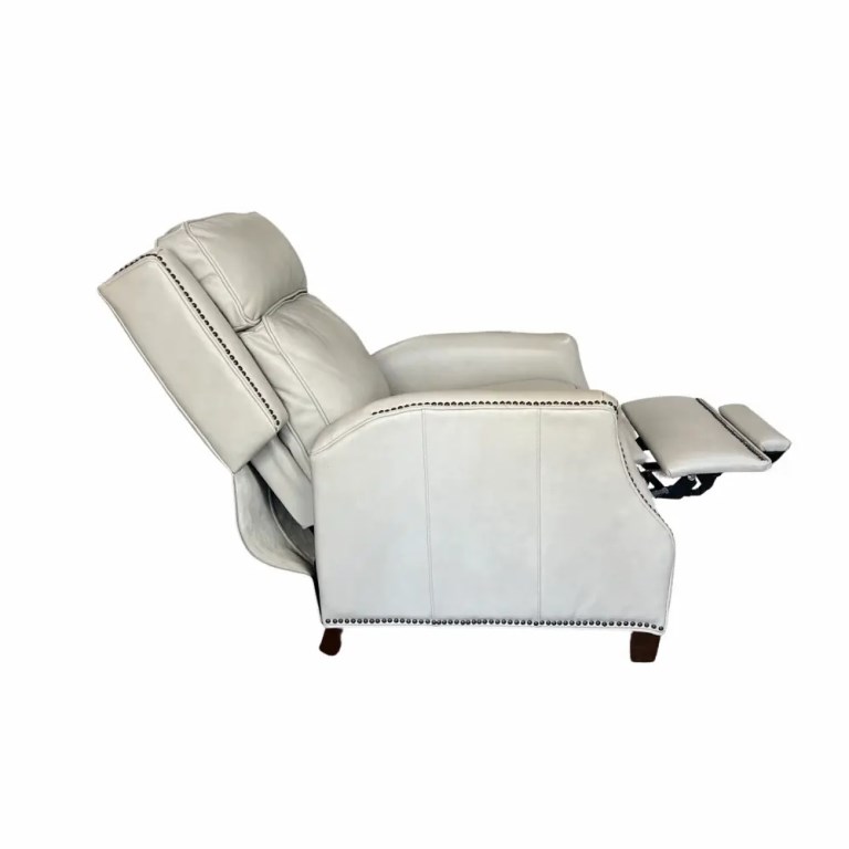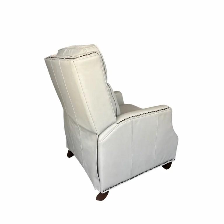A sophisticated high back push thru the arms 3-way recliner with articulated head rest for superior head support. Welts and nail head trim accents the wings, side rails, arms and ottoman. Tight welted box seat cushion has pocketed coil springs for lasting comfort. The hand carved tapered wood legs are finished in a dark mahogany color.