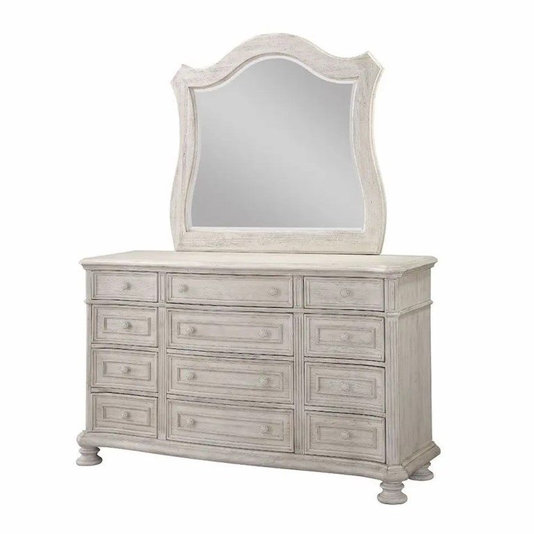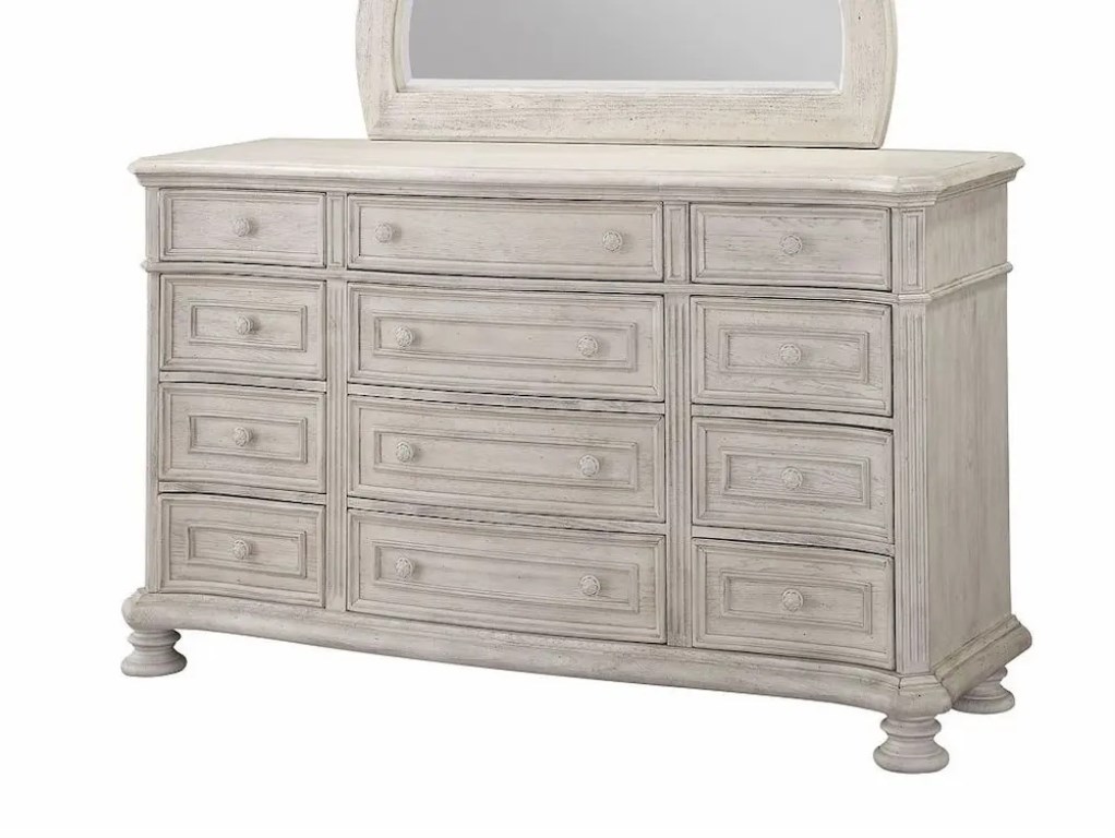 The design and finish elements of Ginyard will bring style to any bedroom. The sandblasted off white finish has a hint of pecan coming through the finish. The large dramatic upholstered bed with button tufting will be relaxing and stylish. Need a hidden drawer for valuables, the nightstand will have you covered. It comes with a hidden drawer along with a night light. The back of the nightstand has dual USB charges to keep your electronics close by and charged. Product Features: Collection: Ginyard Traditional bedroom constructed of solid rw/poplar with pecan veneers in a sandblasted off white paint finish with grain detail visible Cases have sepentine tops,solid wood edges, fluted pilasters, 45 degree canted corners, thick detailed tops, double framed drawer heads, turned bun feet and return moldings. Tops have veneer border in short grain pecan. 12 drawers Bottom cedar lined drawer Top drawer felt lined Antique white hardware Drawer construction: 45 mm ball bearing glides and french/english dovetail 4 piece box