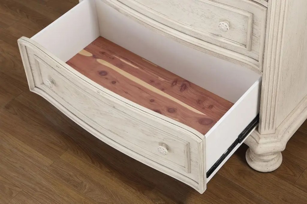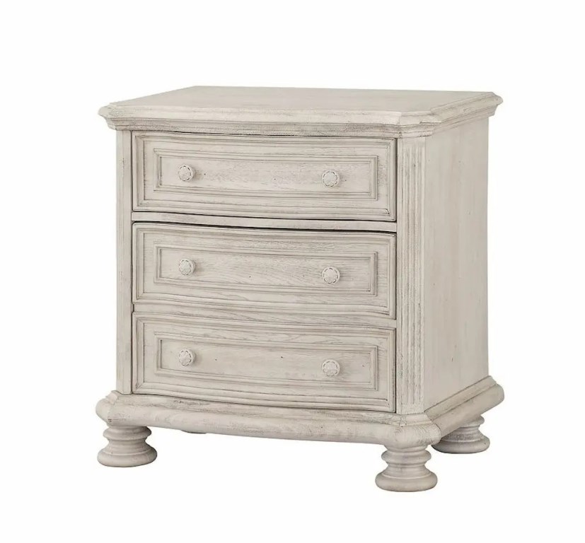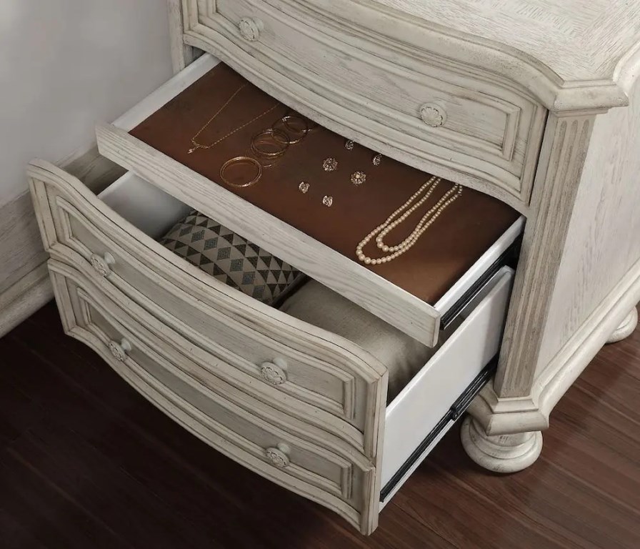 The design and finish elements of Ginyard will bring style to any bedroom. The sandblasted off white finish has a hint of pecan coming through the finish. The large dramatic upholstered bed with button tufting will be relaxing and stylish. Need a hidden drawer for valuables, the nightstand will have you covered. It comes with a hidden drawer along with a night light. The back of the nightstand has dual USB charges to keep your electronics close by and charged. Product Features: Collection: Ginyard Traditional bedroom constructed of solid rw/poplar with pecan veneers in a sandblasted off white paint finish with grain detail visible Cases have sepentine tops,solid wood edges, fluted pilasters, 45 degree canted corners, thick detailed tops, double framed drawer heads, turned bun feet and return moldings. Tops have veneer border in short grain pecan. Nightstand has hidden valuables drawer and double usb with led night light Three drawers Cedar lined bottom drawer Top felt lined drawer Antique white hardware Drawer construction: 45 mm ball bearing glides and french/english dovetail 4 piece box