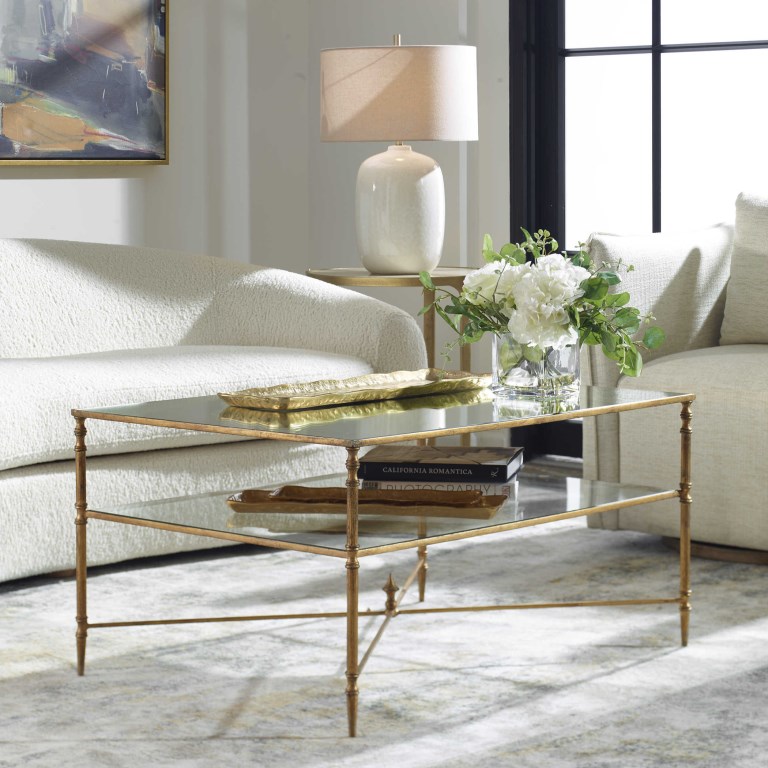 Finished in gold leaf with heavy antiquing on iron frame and iron cross stretchers. Top is reinforced mirror and gallery shelf is clear tempered glass