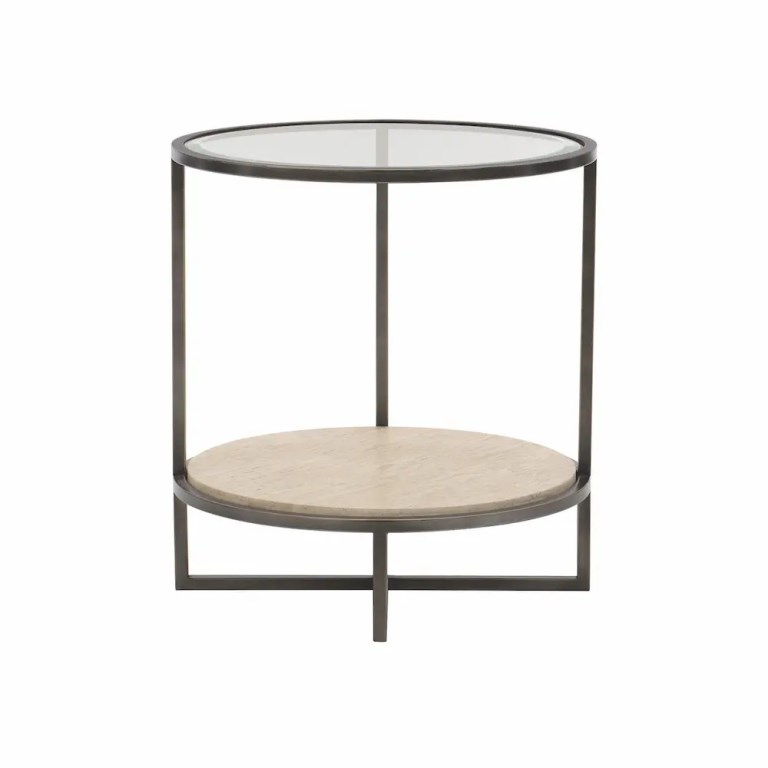 Bernhardt Occasional offers a range of upscale designs for luxe living spaces. With clean lines and quadrilateral shapes, the Harlow round chairside table offers a cool contemporary appeal. The unique open-frame design features a tubular steel base and crisscrossing stretchers in an oil-rubbed bronze finish. A white travertine stone shelf lends a natural element, while an elegant inset tempered glass top contributes to the light, airy feel.
