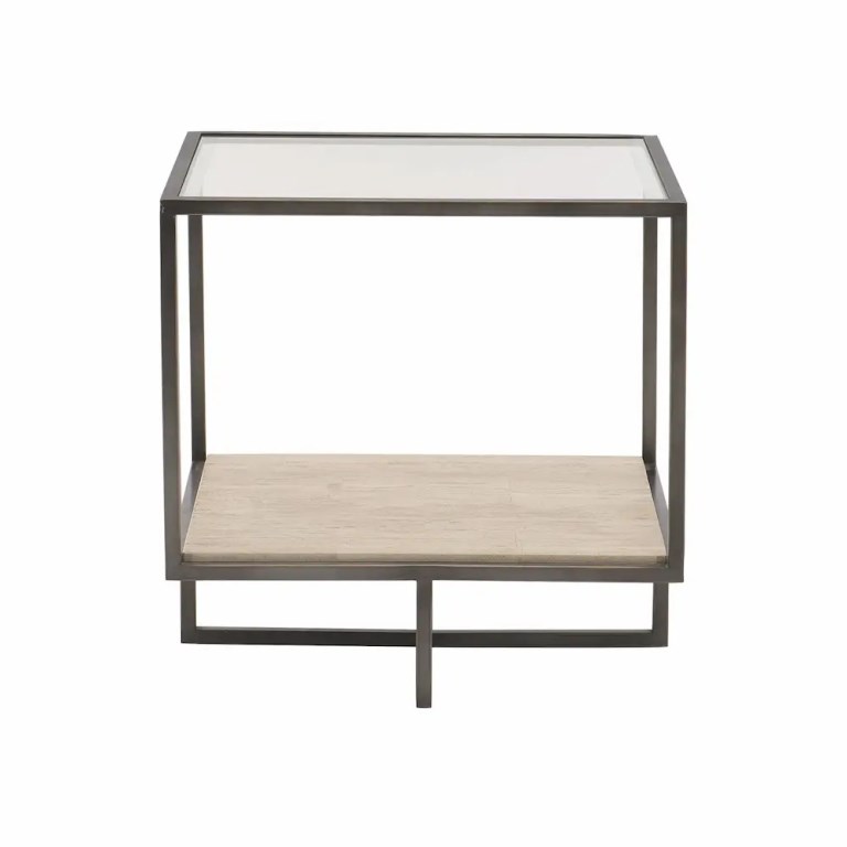 Bernhardt Occasional offers a range of upscale designs for luxe living spaces. With clean lines and quadrilateral shapes, the Harlow end table offers a cool contemporary appeal. The unique open-frame design features a tubular steel base and crisscrossing stretchers in an oil-rubbed bronze finish. A white travertine stone shelf adds a natural element, while an elegant inset tempered glass top contributes to the light, airy feel.