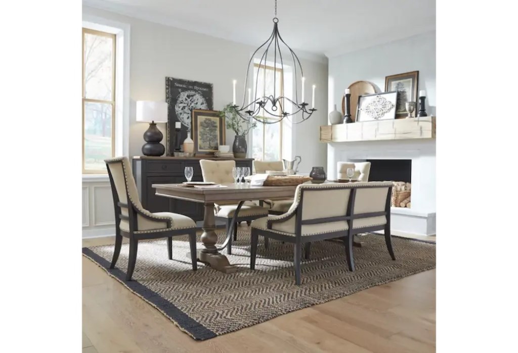 Reinvent your style and comfort with the Kaine Trestle Dining Set with Black Side Chairs, prefect for any room in the house. Features exposed frame to giving you that deconstructed element, tufted back in a truffle linen fabric, nail head accents, web seating and taper