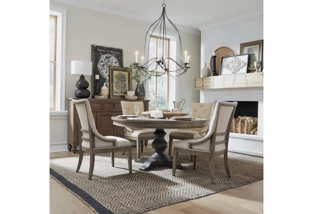 Reinvent your style and comfort with the Kaine Round Dining Set with Black Side Chairs, prefect for any room in the house. Features exposed frame to giving you that deconstructed element, tufted back in a truffle linen fabric, nail head accents, web seating and taper