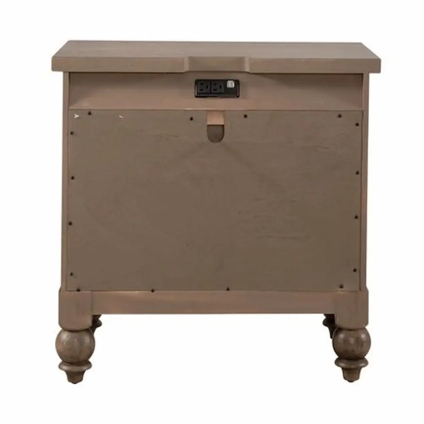 Drawers feature wood framing with beveled edge, full extension metal glides, finished interiors, French/English dovetail construction, felt lined top drawer and cedar lined bottom. Finished in a Dusty Taupe, accented with antique brass drop ring pull hardware. Also offers a charging station in back with two power outlets and two USB ports.