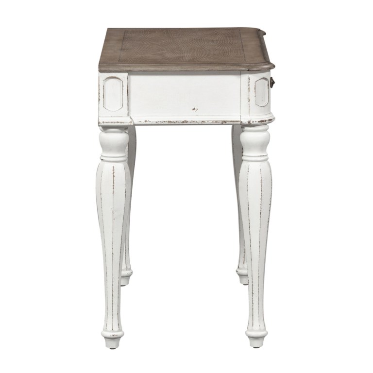 Start your mornings off at your Kirwin accent vanity desk. Crafted of poplar solids with white oak and birch veneers, this piece features the perfect blend of European design, one fully stained full extension drawer that allows for easy access to storage, canted corners, and is accented beautifully by antique pewter knob hardware. Top is finished in a weathered brown with whitewash. Warm antique finishes and artistic distressing along with grand scale create a piece to be passed to generations.
