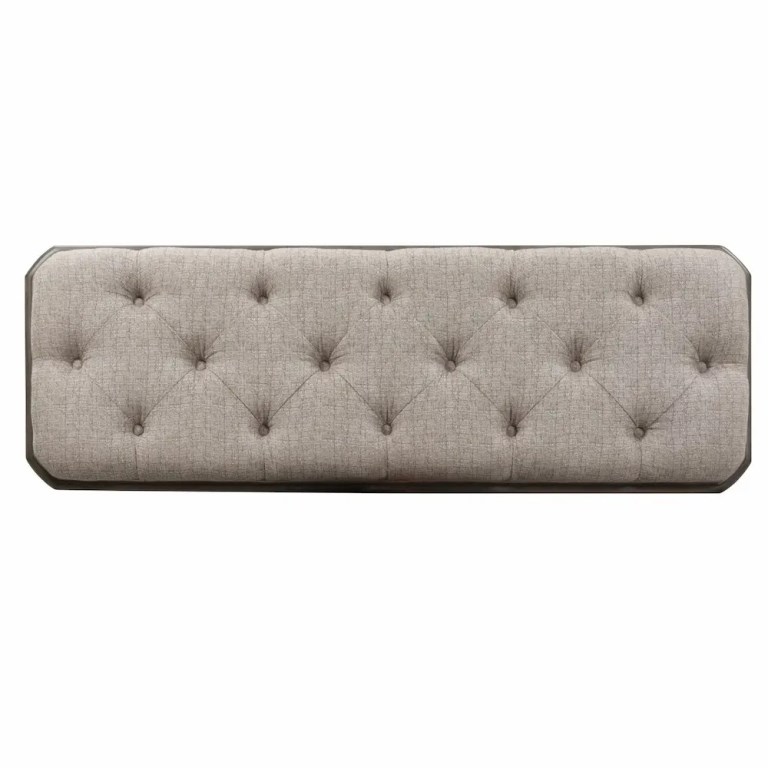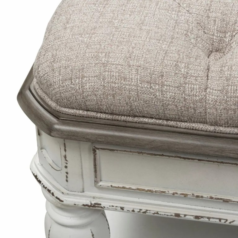 Complete your Kirwin bedroom look with this bed bench. This wooden bed bench constructed with poplar solids as well as oak & birch veneers, features an antiqued white finish accompanied by heavy chipping. Relax in comfort, as the bench is upholstered beautiful ivory tweed chenille and anchored with unique faceted legs with nylon glides, to be sure to protect your space. Maximize storage with the convenient bottom shelf, perfect for storing your everyday items.