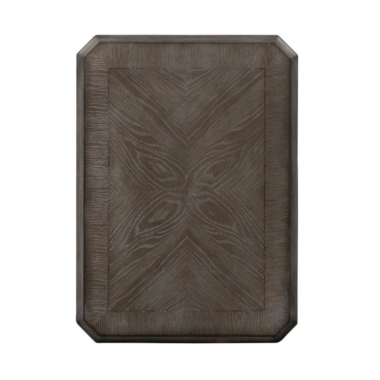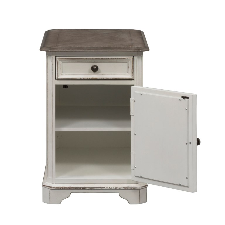 Accent your space with the perfect blend of European design with the Kirwin chair side table. Crafted of poplar solids with white oak and birch veneers, this piece features a weathered brown top with whitewash, one fully stained full extension drawer making access to storage a breeze, a unique fancy face top, wood framed drawer fronts, canted corners, bead molding, one adjustable shelf behind wood framed door with antique mirror and decorative grid panel for added user convenience, and is accented by antique pewter knob hardware. Warm antique finishes and artistic distressing along with grand scale create a piece to be passed to generations.