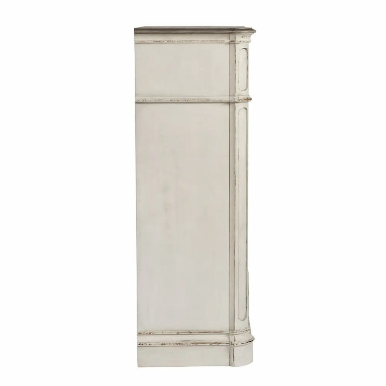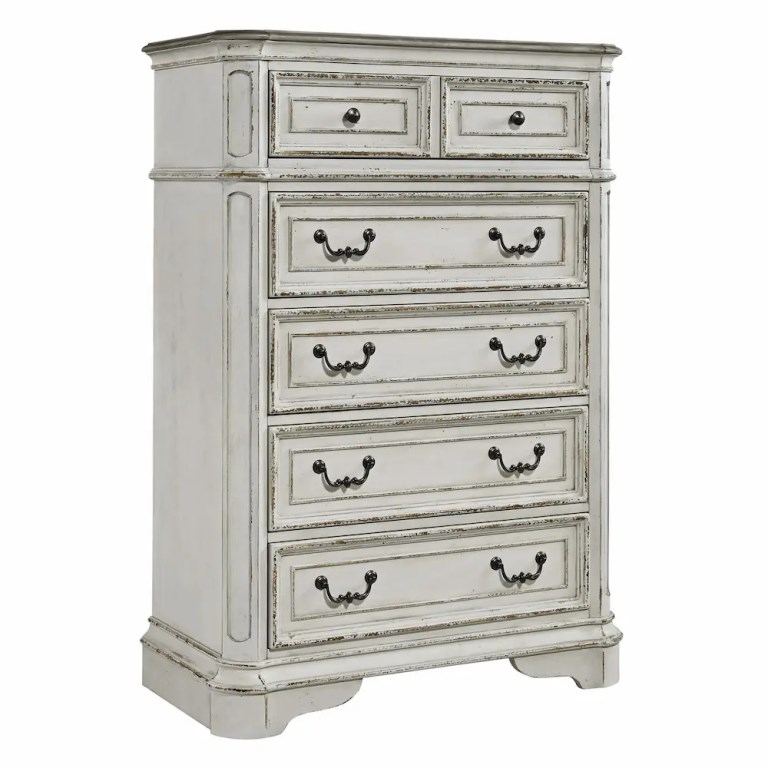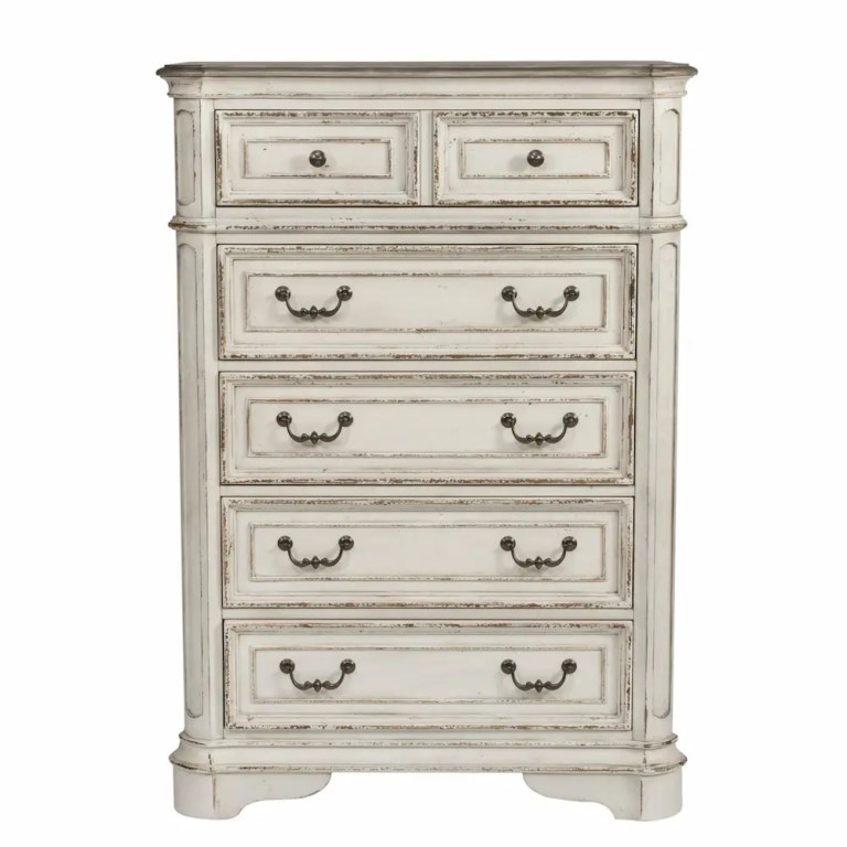 This 5-drawer chest is the perfect way to accent your room with an effortless blend of European Traditional design. Weathered brown whitewash top paired with the antique white finish creates a truly unique look. Softness is added to the design with canted corners and rounded pilasters, accompanied by bead molding on each drawer front. The chest features fully stained interior drawers, felt lined top drawers, and cedar lined bottom drawers that are accented by custom antique pewter bail and knob hardware.
