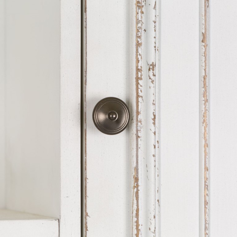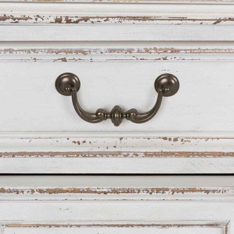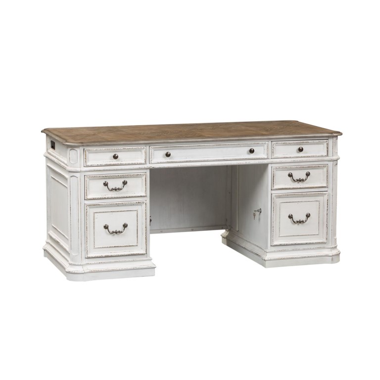 Blend European influences to create the Kirwin credenza and hutch. Crafted with poplar and rubberwood solids with white oak and birch veneers, this piece features framed drawer fronts accented by antique pewter hardware, two large file drawers that can be locked, an open display for storage illuminated by touch lighting, and a flip-down keyboard tray. With today’s modern technology in mind, users can enjoy the convenience of the built-in wire management provisions, two outlet ports, and two USB ports. The planked back panel flows throughout the hutch, even behind the two doors where adjustable shelving is located. Warm antique finishes and artistic distressing along with grand scale a group to be passed to generations.