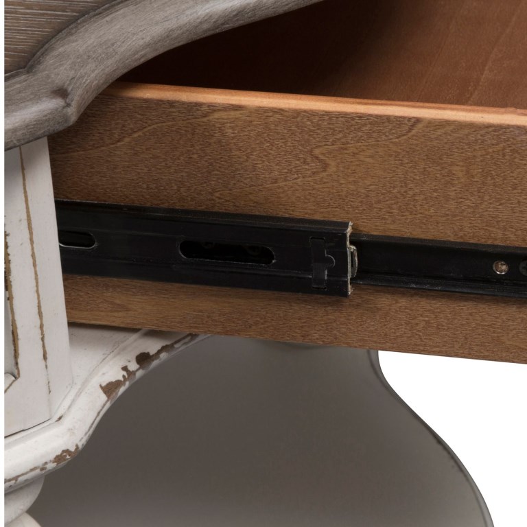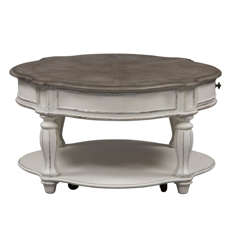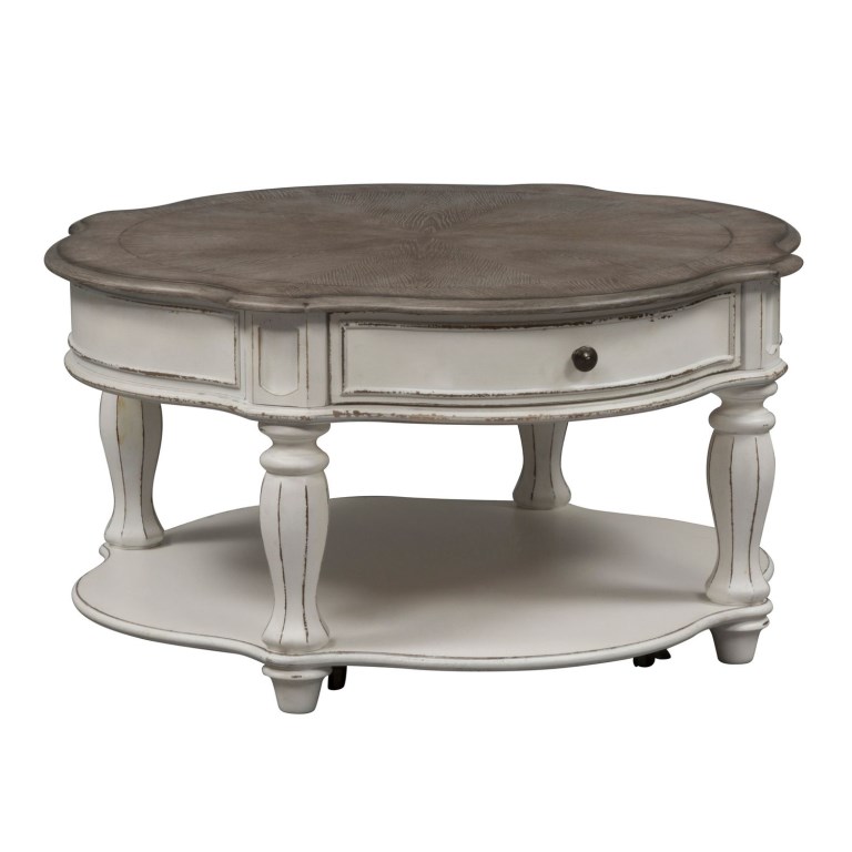 Accent your space with the perfect blend of European design with the Kirwin round cocktail table. Crafted of poplar solids with white oak and birch veneers, this piece features a weathered brown top with whitewash, unique cloverleaf shape, faceted turned legs, one fully stained interior drawer with full extension drawer glides making access to storage a breeze, fancy face top, casters that make rearranging effortless, framed drawer fronts accompanied by bead molding, and is accented by antique pewter knob hardware. Users can enjoy the added storage for items from magazines, to cozy throw blankets with the bottom shelf. Warm antique finishes and artistic distressing along with grand scale create a piece to be passed to generations.