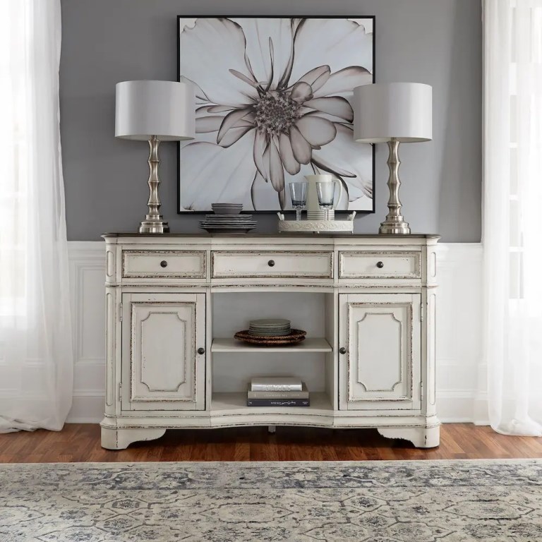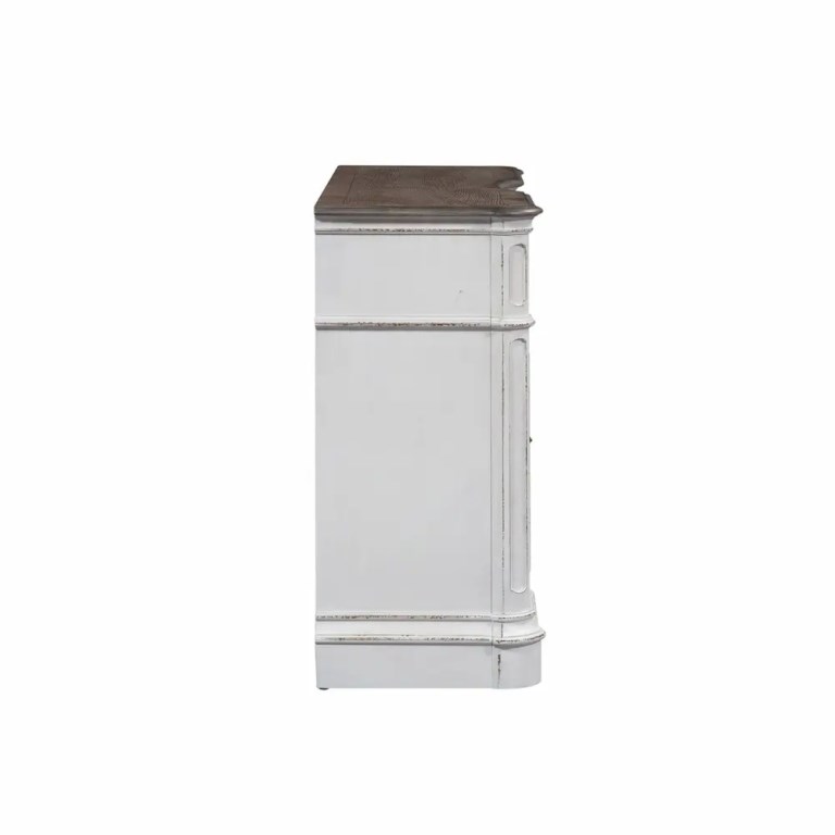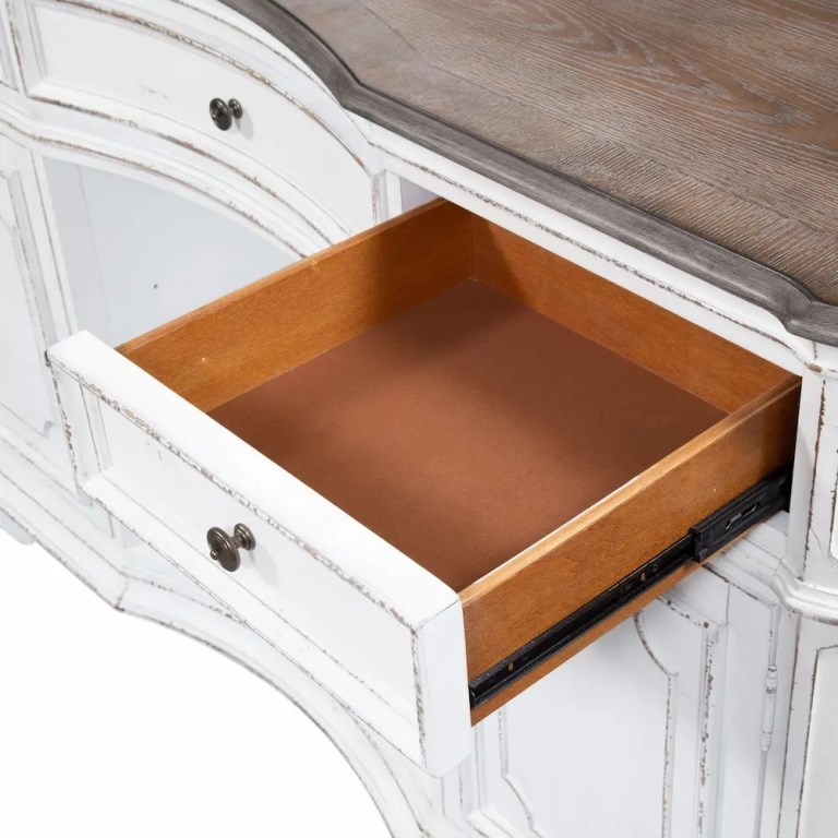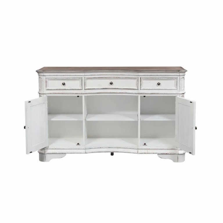 Indulge in the perfect blend of European design with the Kirwin server. Crafted of poplar solids with white oak and birch veneers, this piece features fully stained full extension drawers with felt lining for easy access to storage, a centered concave top drawer flanked by two storage drawers and doors, a convenient center shelf for added storage, and is accented by antique pewter knob hardware. Storage abounds with an adjustable shelf located behind the two doors, the center open area with an adjustable shelf, and the wood framed drawers. The attention to detail is impeccable with the weathered brown finish accented by whitewash, the canted corners, rounded pilasters, and bead molding anchored down by the bracket feet. Warm antique finishes and artistic distressing along with grand scale a group to be passed to generations.