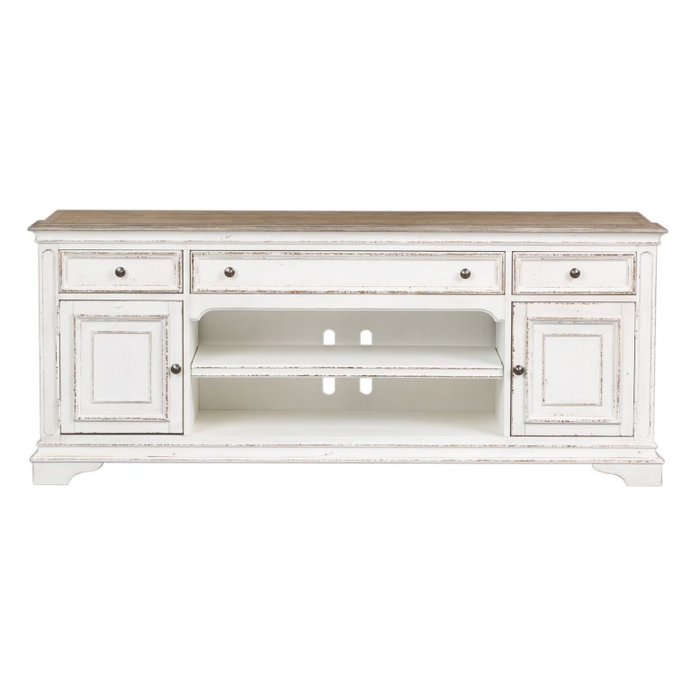 This European traditional styled 70″ tv stand is sure to be the focal point of any living room and can accommodate most 75″ TVs. Crafted with poplar solids and white oak and birch veneers, this piece features an antique white finish, wood framed drawer fronts, and adjustable shelf space. This tv stand must be sold with the wall unit, as it cannot stand alone. With today’s modern technology in mind, users can enjoy the convenience of the wire management provisions to hide those pesky wires from your DVD player or gaming console of choice.
