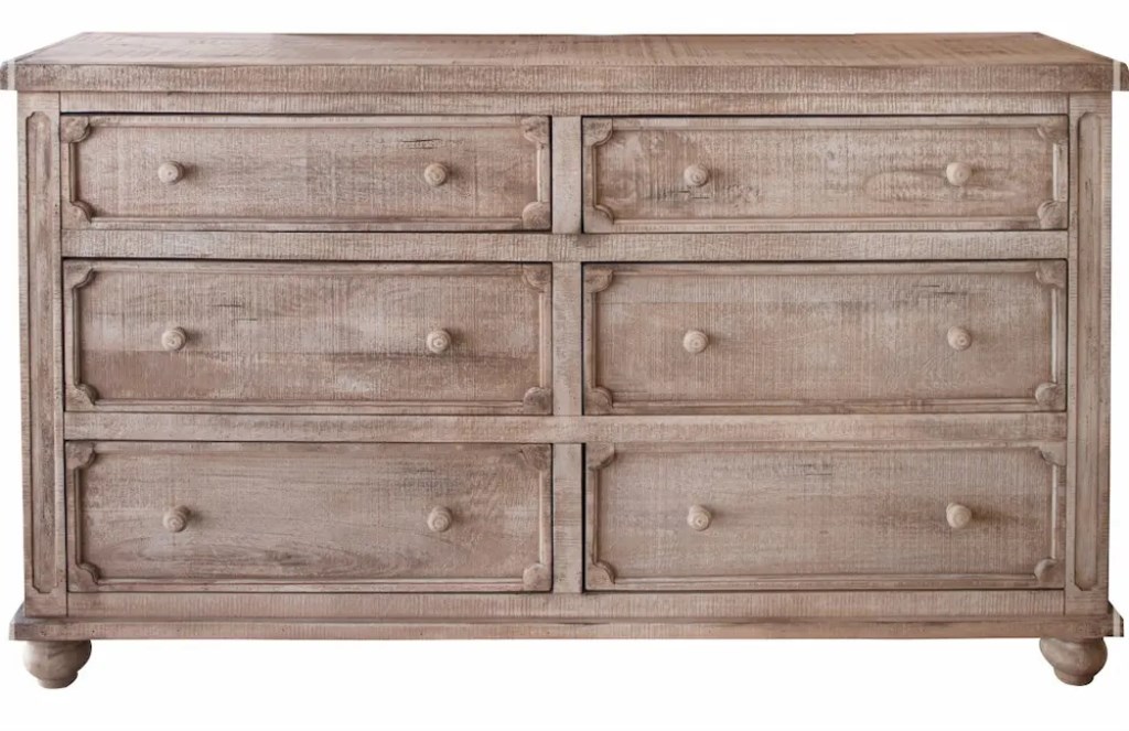 100% solid mango wood on case goods provides durability and a rich wood grain. Headboard, footboard and rails feature unique engineering to help avoid warping and seasonal cracks. Inspired by the grandeur of the Old World with an eclectic feel. Our elegantly subtle Drift Sand finish enriches the natural mineral deposits on the mango wood grain, providing unique texture and depth. Mortise and tenon joinery on solid wood frames ensure stability and durability. Solid wood drawers feature English dovetail joinery on drawer fronts. Ball bearing Hafele metal glides provide a durable and effortless glide. Microfiber-lined top drawers on dresser and nightstand. Generous-sized drawers offer ample storage capacity. Box spring is required. May be used with adjustable mattress bases.
