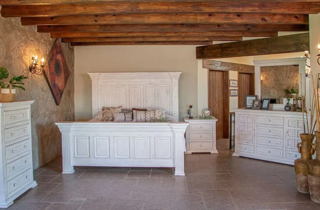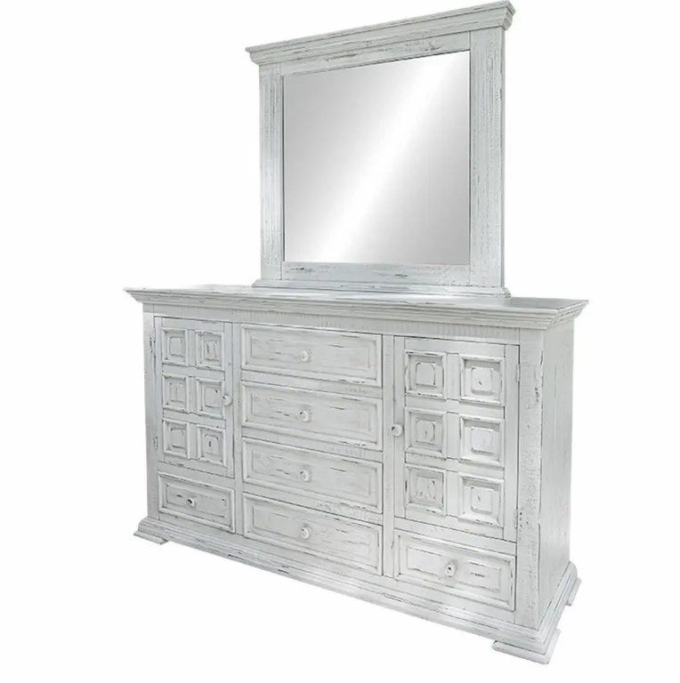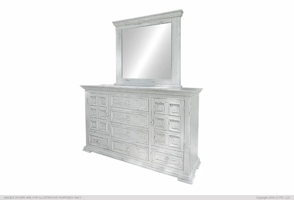1. Featuring solid pine. This oversized bedroom will surely make a statement in any home. 2. Multi step nitrocellulose based lacquer finish in a beautiful distressed vintage white finish. 3. Mortise and tenon case construction on all pieces. 4. Microfiber lined top dresser drawers. Ball bearing metal glides. Magnetic catches on doors. These are just a few quality characteristics that make our Old World Terra Bedroom functional as well as beautiful.