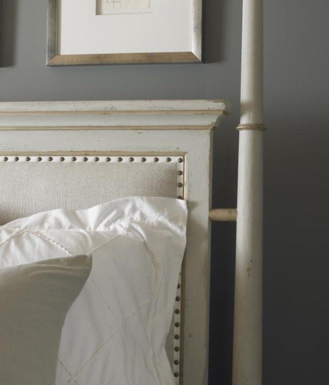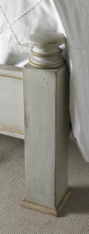 This dramatic Regency styled poster bed is constructed of poplar solids and finished in a distressed Swedish worn light grey finish with hand applied antique linen accents and a textured linen fabric panel trimmed with tape and spaced nails. The footboard posts are removable for a platform bed option. This option is great for rooms with large TVs that’s might have their view obstructed by the footboard post.