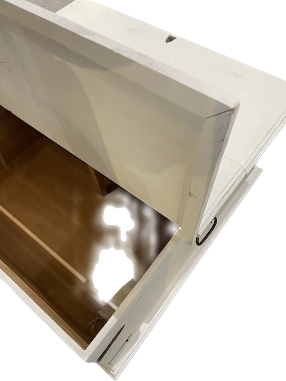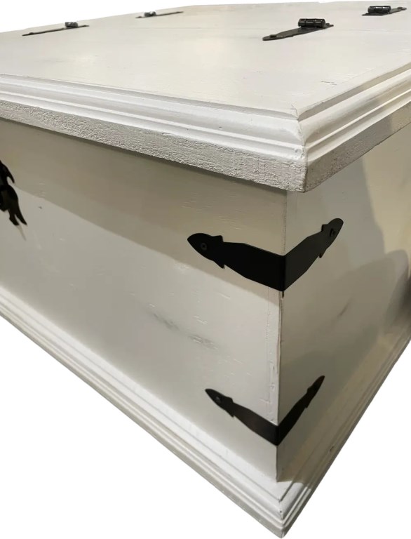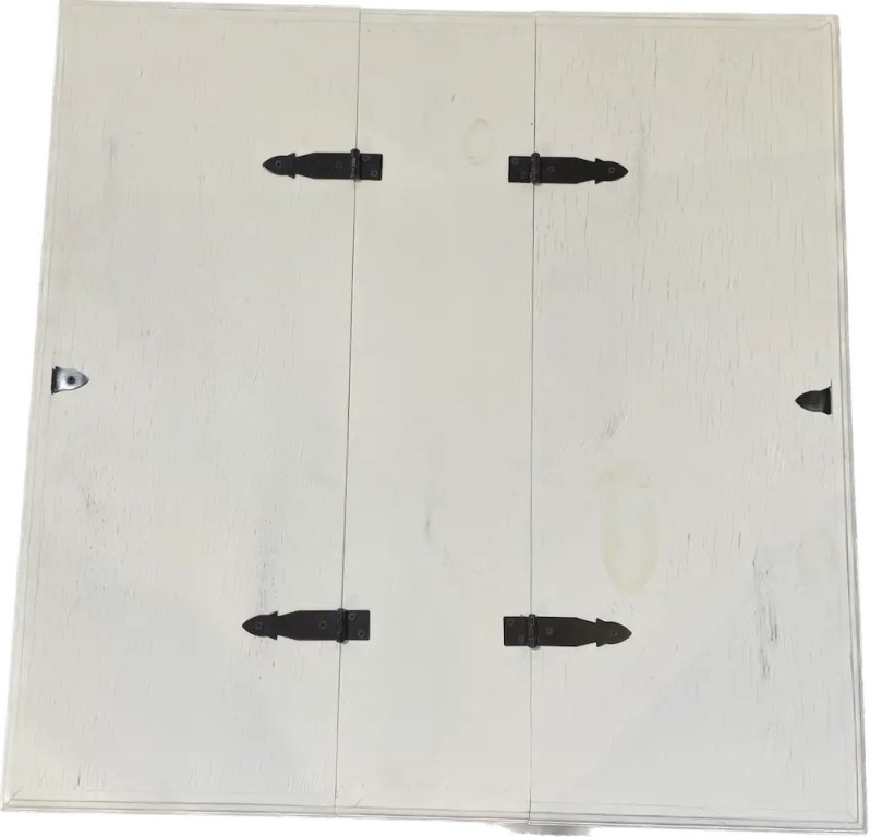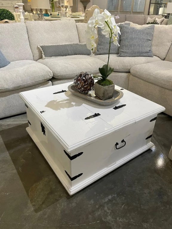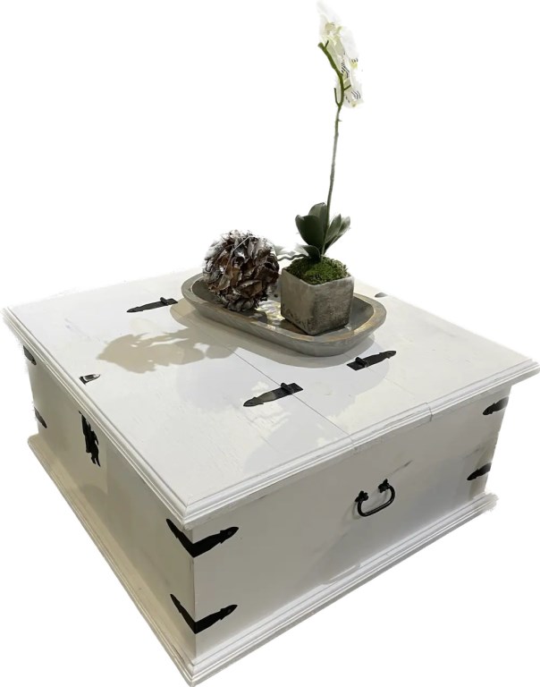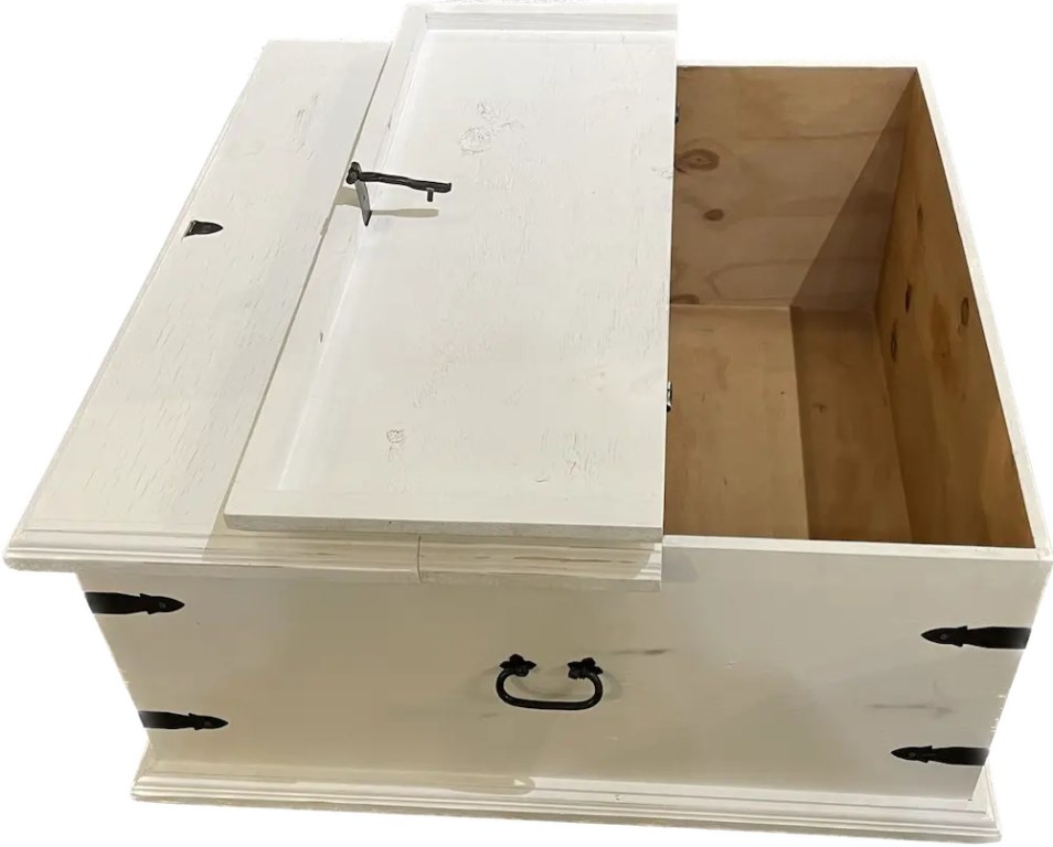 Double take. Sporting a rustic finish, dual-sided lid design and expansive storage space, this square coffee table takes the art of rustic farmhouse living to a new level. Designer touches include plank-effect styling, heavy distressing and industrial bracket hardware.