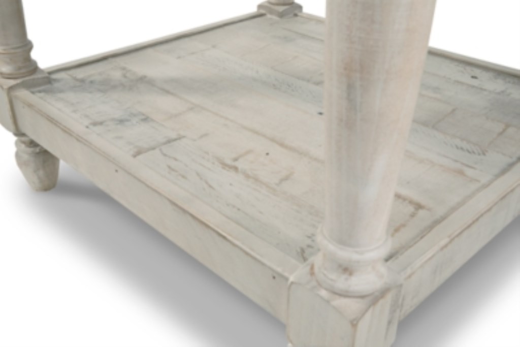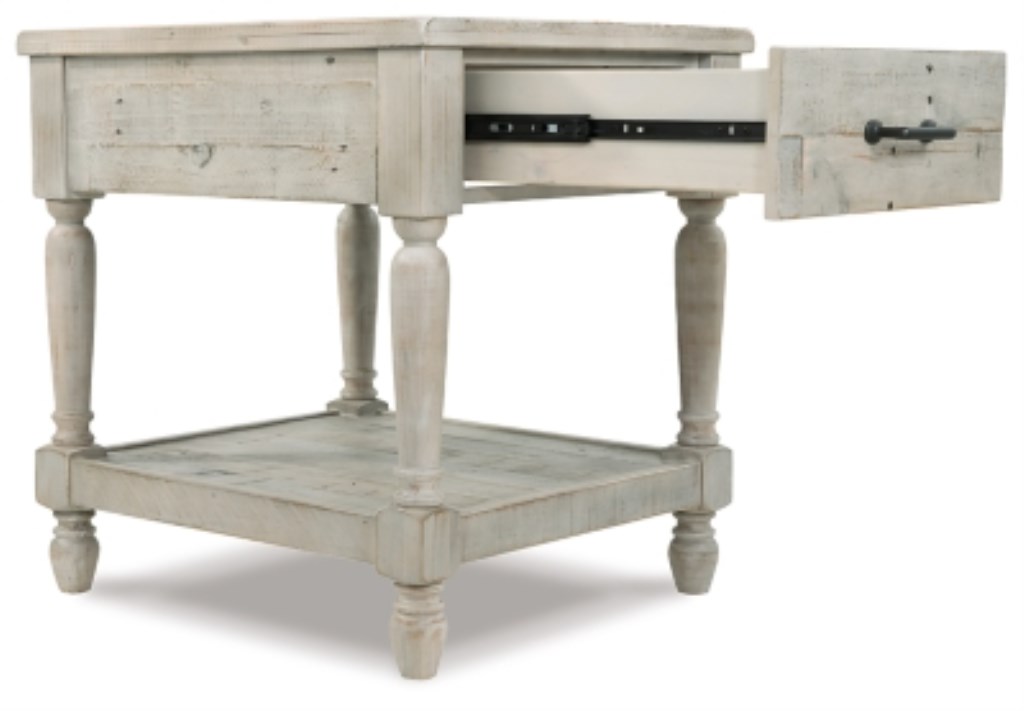 Inspired pieces create inspired spaces. This rectangular end table charms your home with farmhouse style. White textural finish highlights the weatherworn feel of the wood tones and purposeful nail holes. Roomy drawer puts essentials out of sight. Display fashionable books or decor on the planked tabletop and bottom shelf.