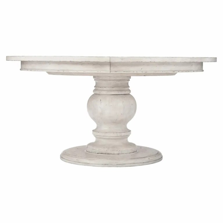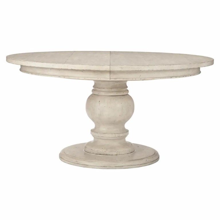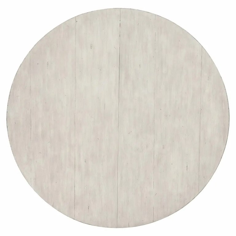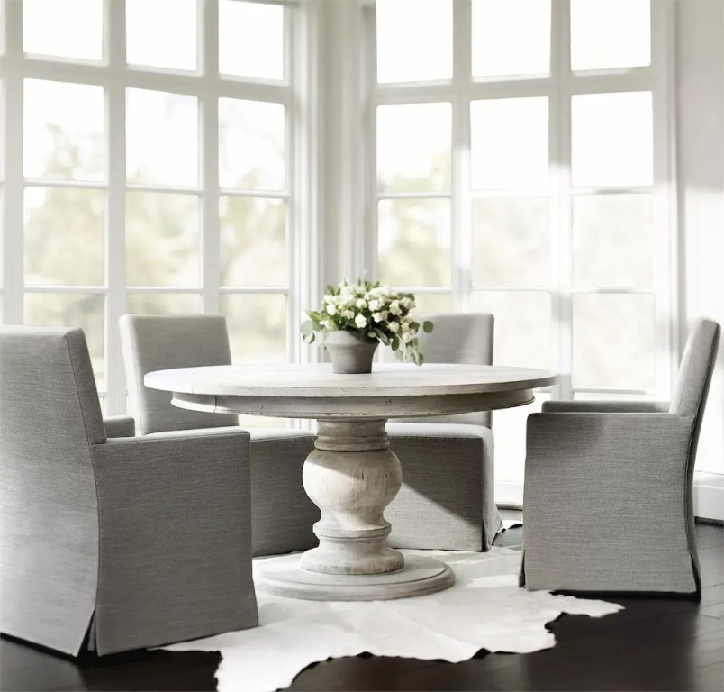 “Elegance is combined with rustic charm in this round dining table, superbly crafted from gently aged whitewashed wood. Inspired by 17th century French Provincial furnishings, Mirabelle balances traditional forms with casual style. The focal point of the Mirabelle dining table is its turned pedestal base, refined and softened by a gently worn whitewashed finish. The casual Cotton finish combines with graceful curving lines for a look that is sophisticated and dressy, yet relaxed and inviting.