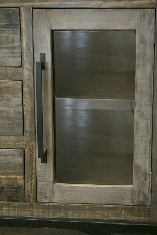 - TV stand features an open back for wire management and fixed shelves behind glass doors.