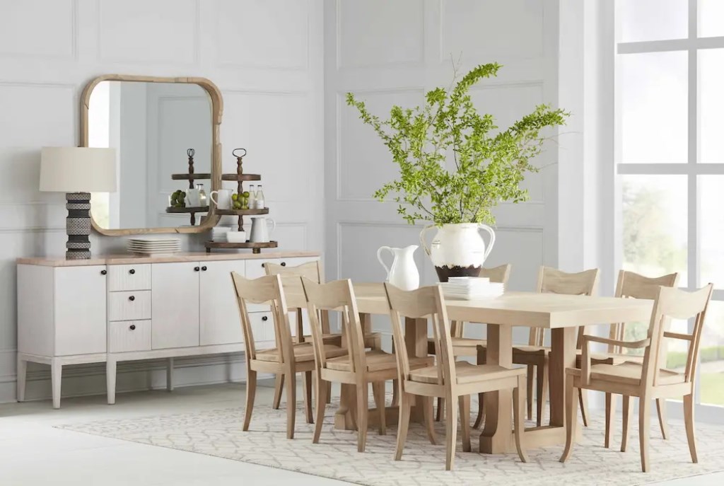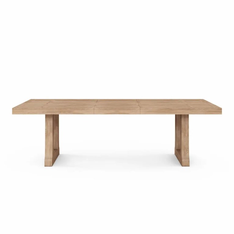 The sturdy trestle base of this dining table echoes the farmhouse style that defines this collection, constructed of ash solids veneered in plank effect oak. Its lengthy dining surface welcomes guests to sit down to both casual family meals and lively dinner parties, comfortably seating up to eight, with a 100″ top that extends to 122″ with a removable leaf. This side dining chair is inspired by traditional farmhouse seating, in a streamlined modern take on the classic slat back chair. Crafted from solid wood and warm-toned veneer in an almond tone.