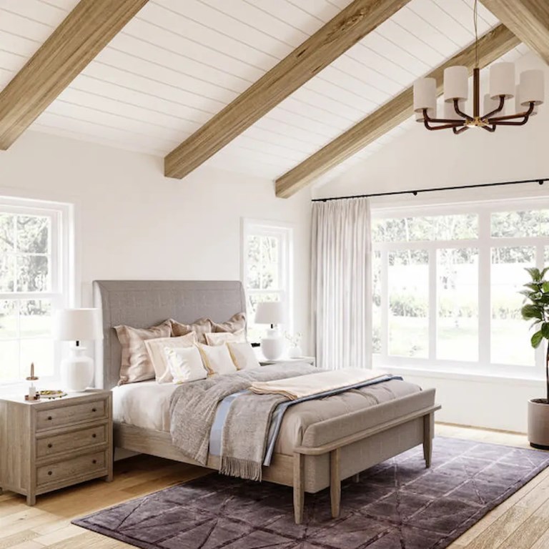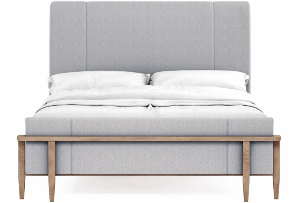For those who dream of style, this subtly striking panel bed blends comfortable form with function in a contemporary aesthetic, featuring finely tailored upholstered panels in a soft grey woven fabric. Exposed wood frame details provide a hint of the farmhouse-inspired craftsmanship that defines this collection, refreshed with a streamlined modern feel.