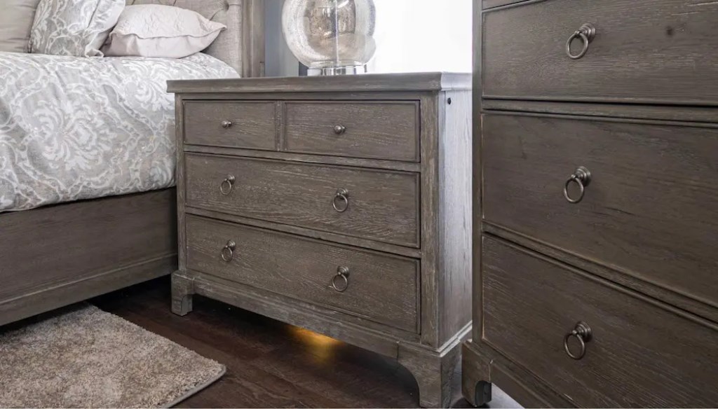 Step into a magical land where stunning beauty and intelligent design meets complete affordability. Our Patina collection is about transitioning dreams to reality. Each piece is a hand-finished burnished bark soft tone. Crafted from select White Oak veneers and Rubberwood solids. Open the drawers and you’ll find upgraded ball-bearing glides, each drawer is English dovetailed for added strength, and lined with Cedar. The perfection of quality and style. The collection includes a choice of Nightstands. The 38″ mirror nightstand or the larger 36″ wood nightstand, each features a built-in power pack for all your charging needs and personal night light. Choose one or the other or even one of each.