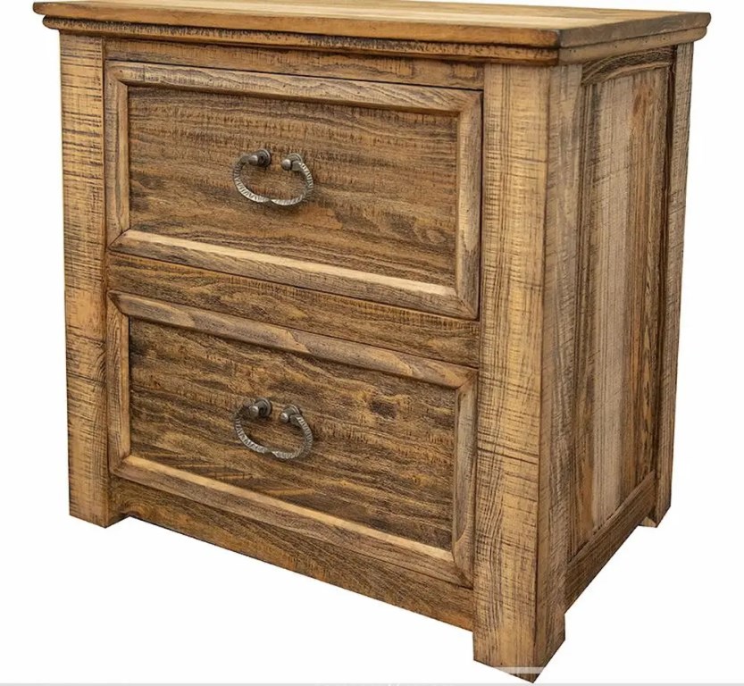 - Multi-step lacquer finish on wire-brushed wood provides depth and character