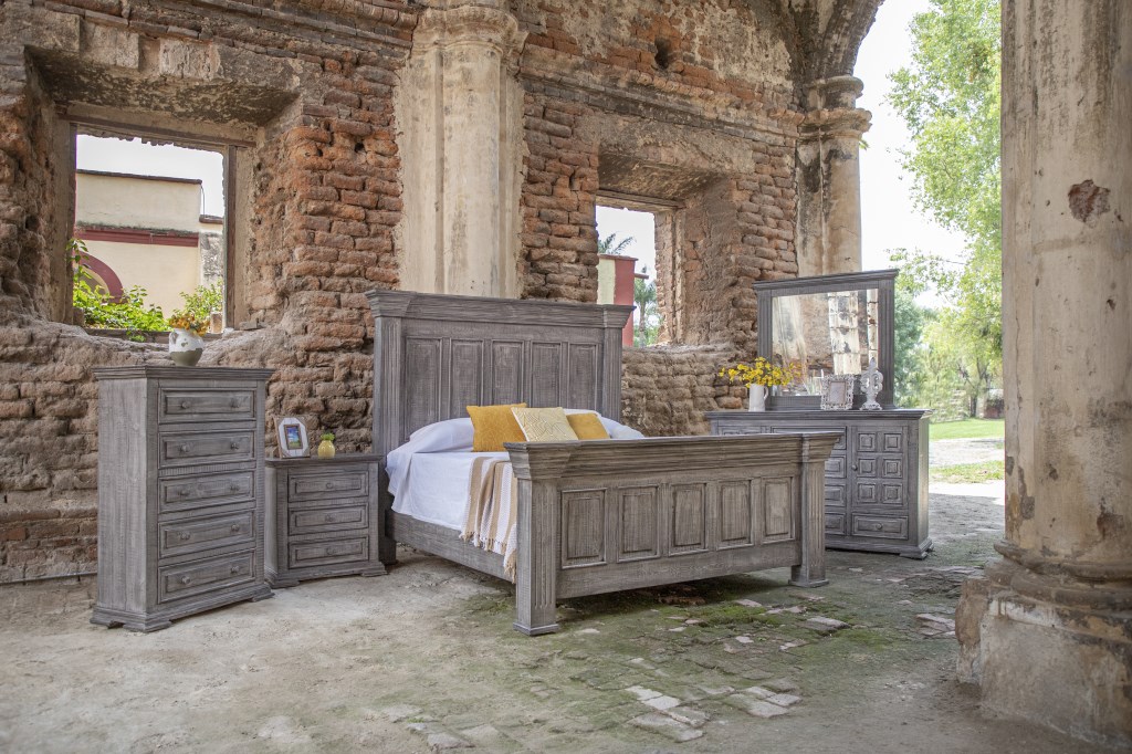 Hand-rubbed, multi-step lacquer finish for a weathered gray finish.
