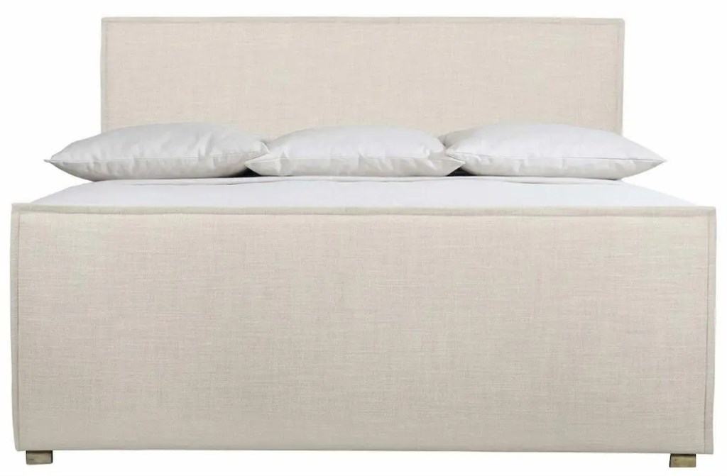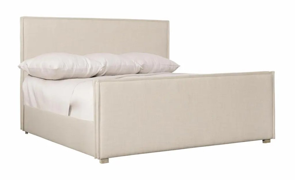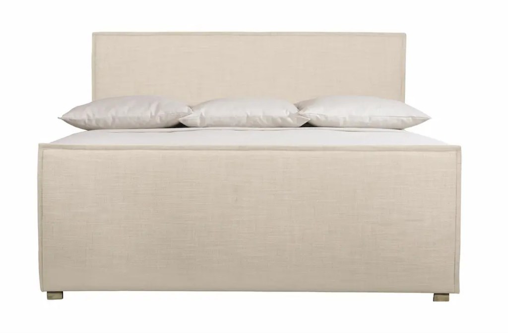 For an understated, organic look, this upholstered bed combines a simple modern form with textural fabric and thoughtful tailoring.