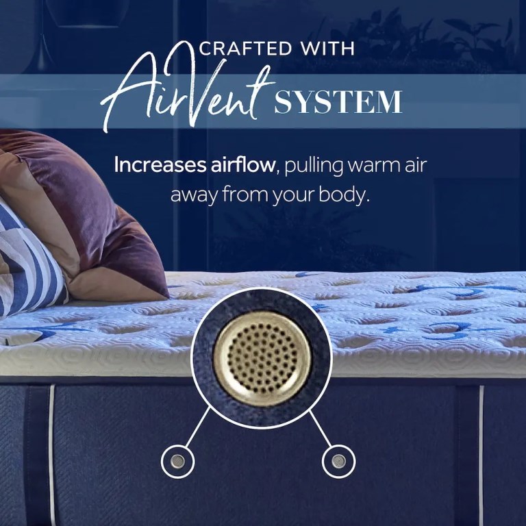 A ventilated coil system works with external air vents to increase breathability and provide cool sleep throughout the night.