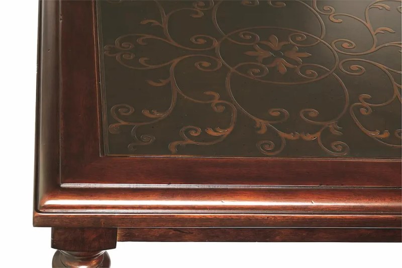 Bernhardt Occasional offers a range of upscale designs for luxe living spaces. Exuding traditional charm, the Valencia cocktail table joins trumpet legs with an embossed metal inset top. The intricate scrolled pattern is bordered by cherry veneers with a rich and luxurious tone. Turned legs with bun feet achieve an elegant antique look perfect for traditional and transitional styles.